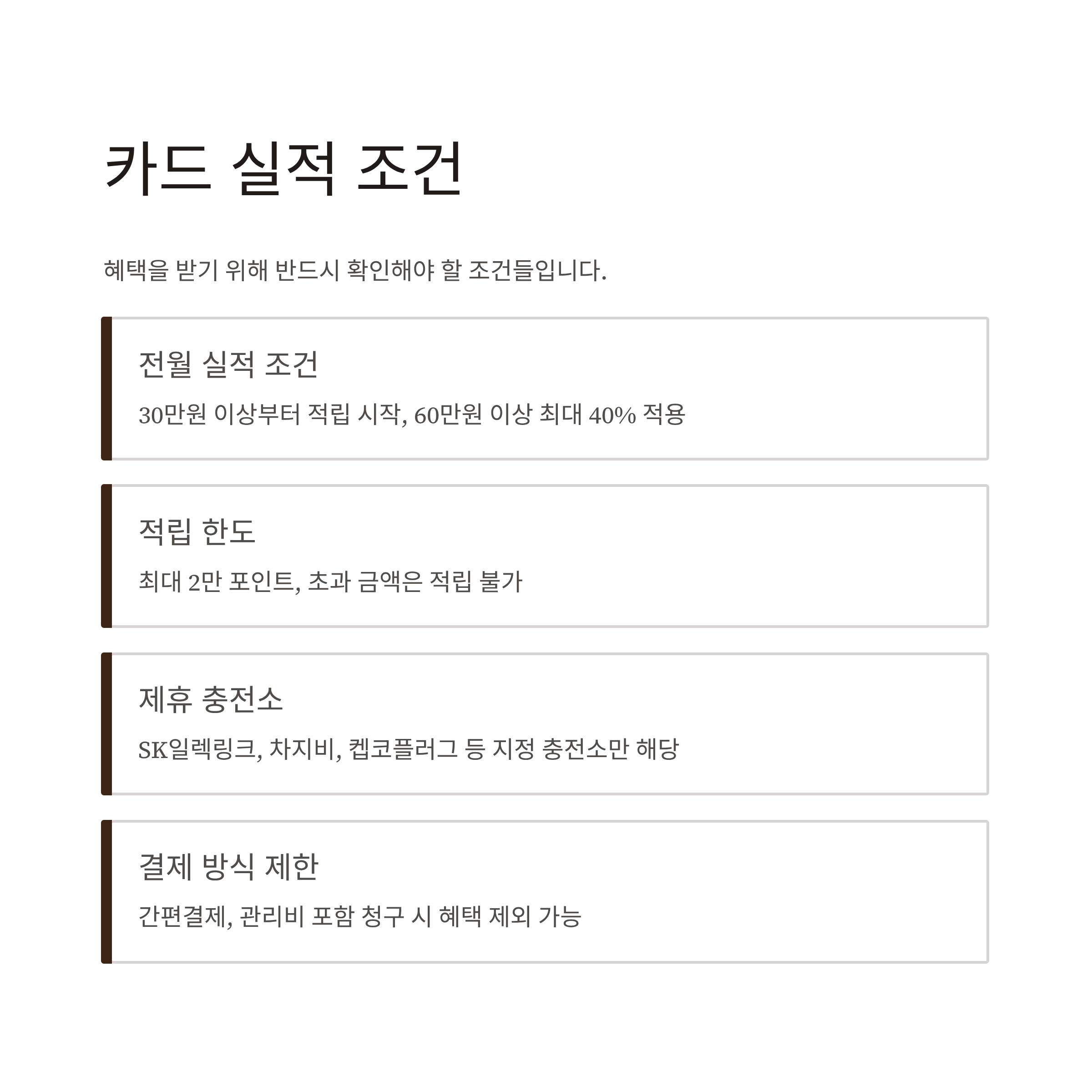 - 다른 카드와의 병행 사용 전략도 유효 — 생활 영역은 신한EV, 충전 특화는 그린카드처럼 활용 가능