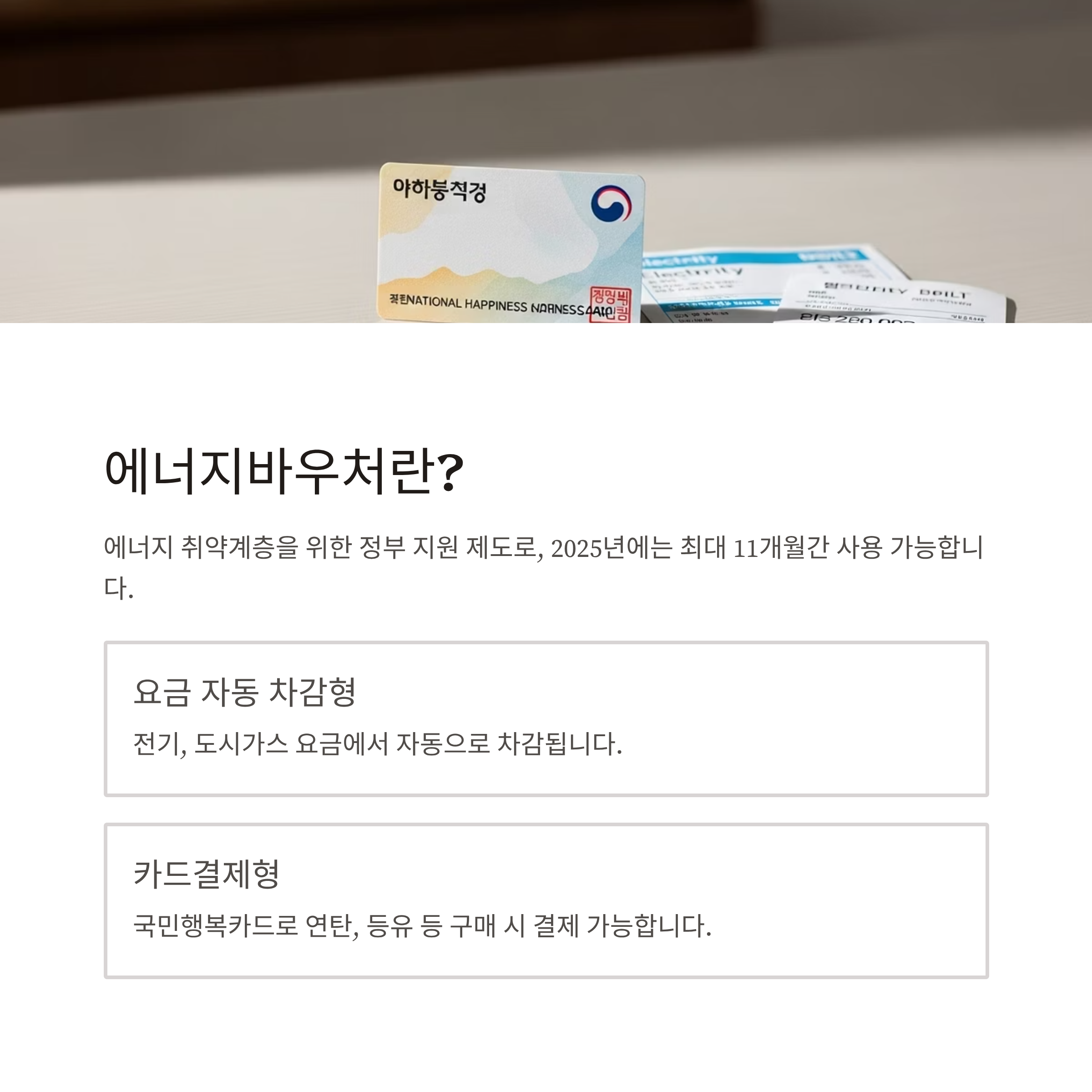 에너지바우처는 정부가 에너지 취약계층에게 전기, 도시가스, 연탄 등 필수 에너지 사용을