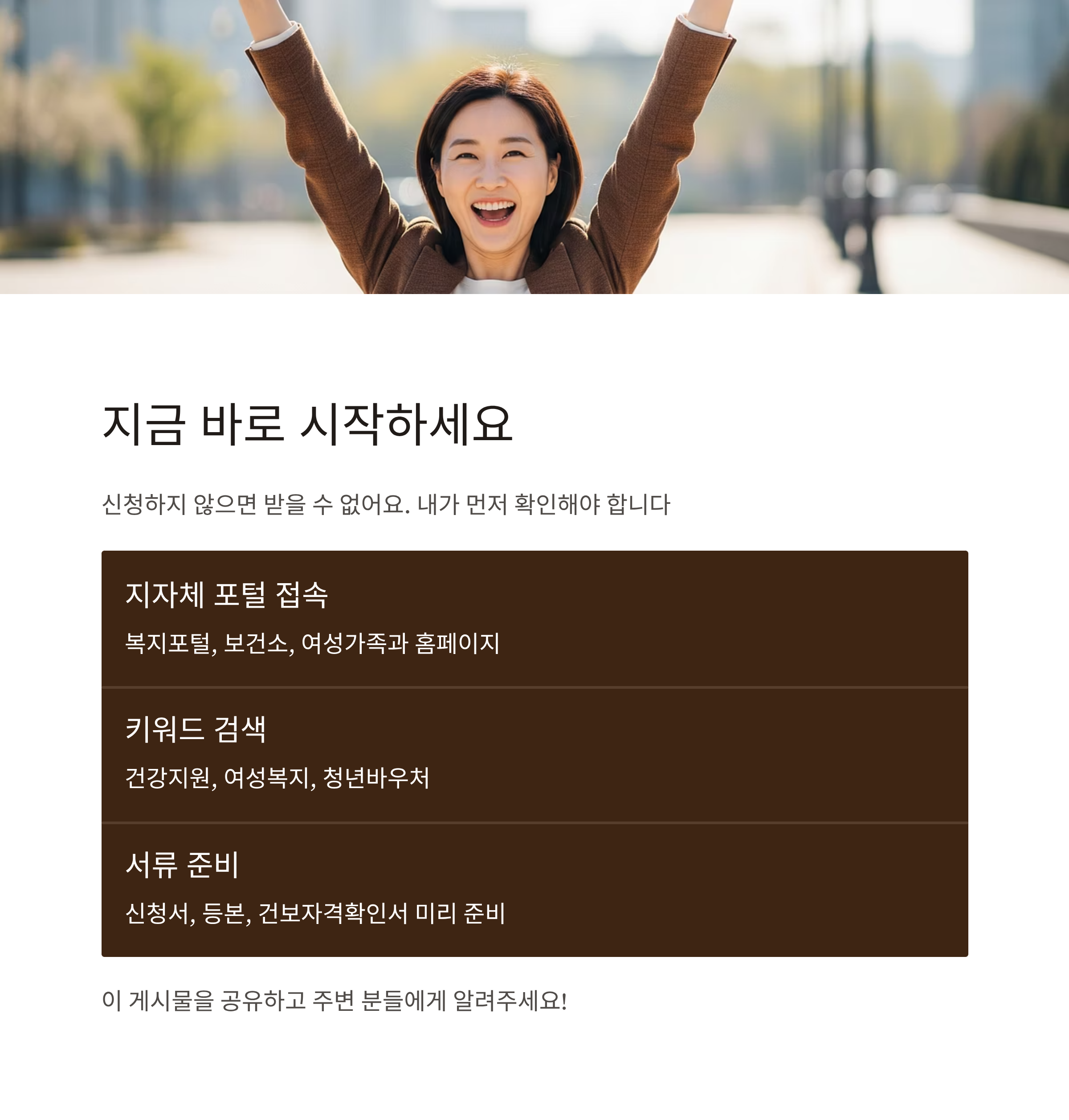 한 번 신청해 보면 생각보다 어렵지 않으니, 지금 사는 지역 복지포털이나 보건소, 여성가족과 홈페이지에 들어가서