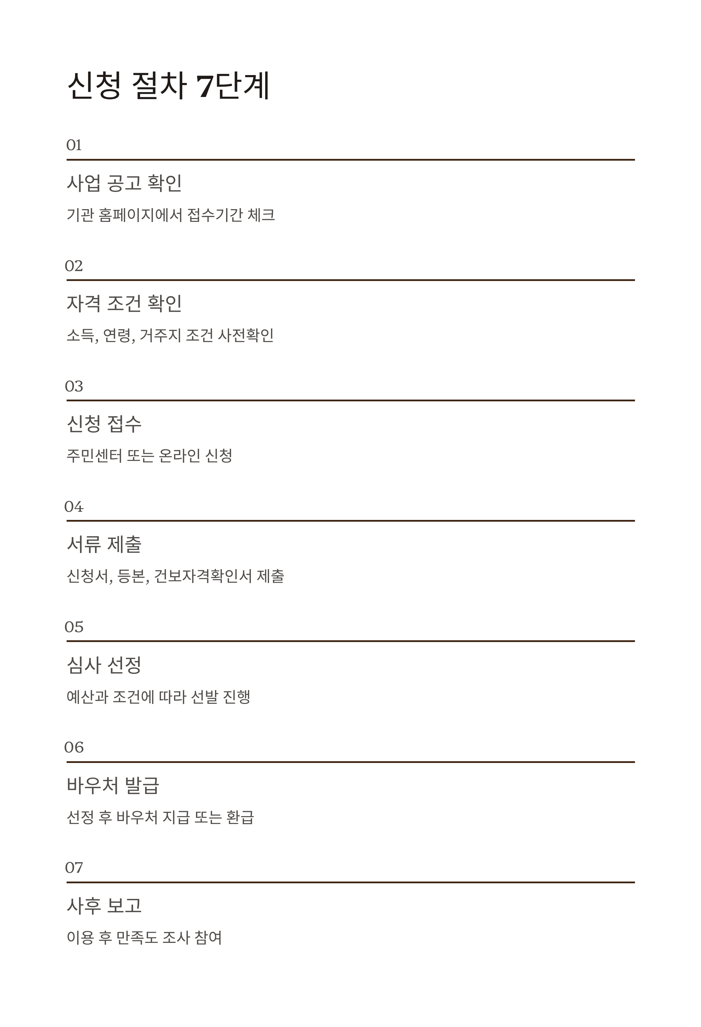 6. 바우처 발급 또는 비용 정산 | 선정 후 바우처 지급 혹은 병원·기관 이용 후 비용 환급 등 방식으로 진행 |