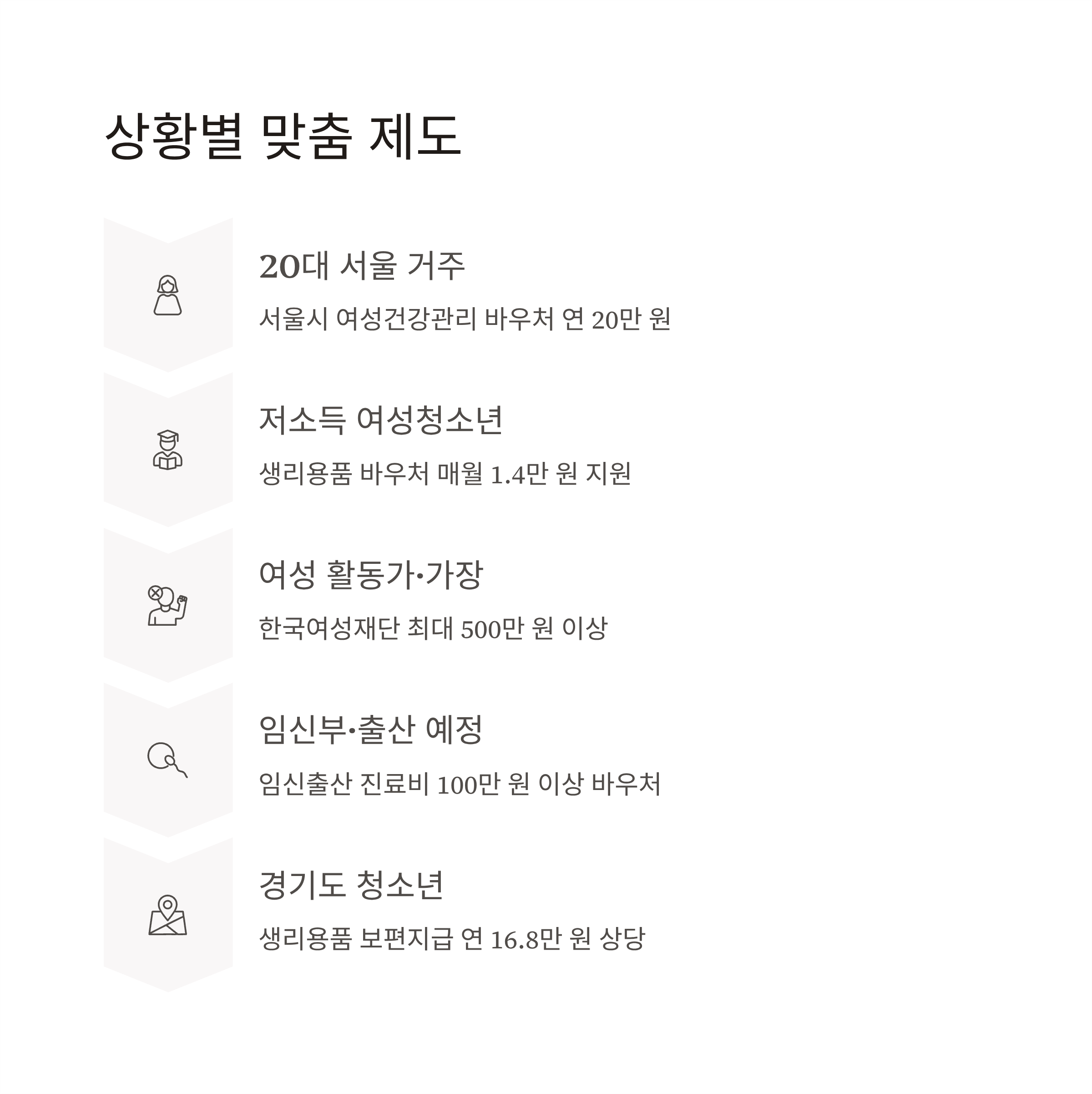 생리용품 바우처 | 생리대 등 위생용품 구매 지원 (월 1.4만 원 수준 등) |