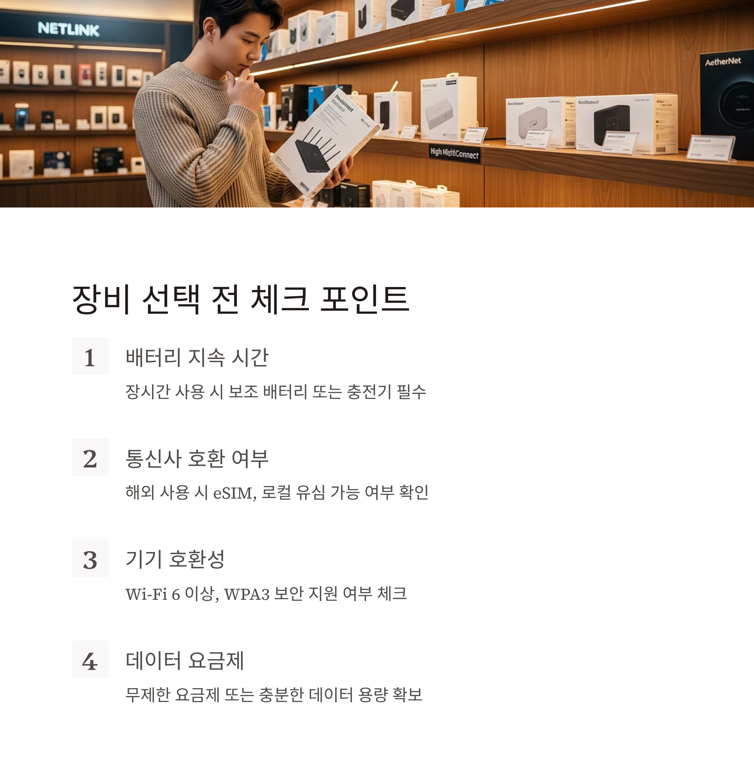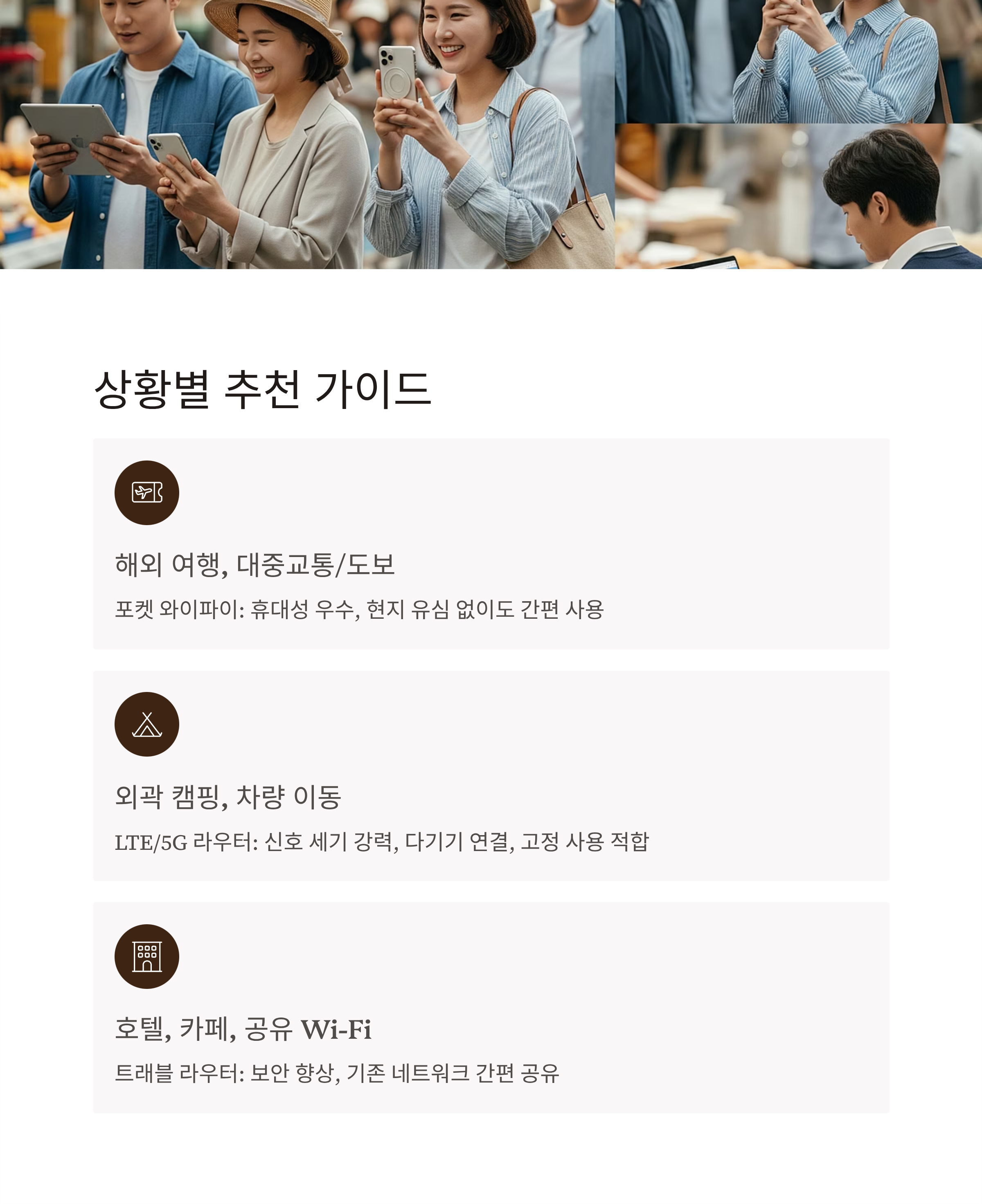 | 해외 여행, 대중교통/도보 중심 이동 | 포켓 와이파이 | 휴대성 우수, 현지 유심 없이도 간편 사용 가능 |