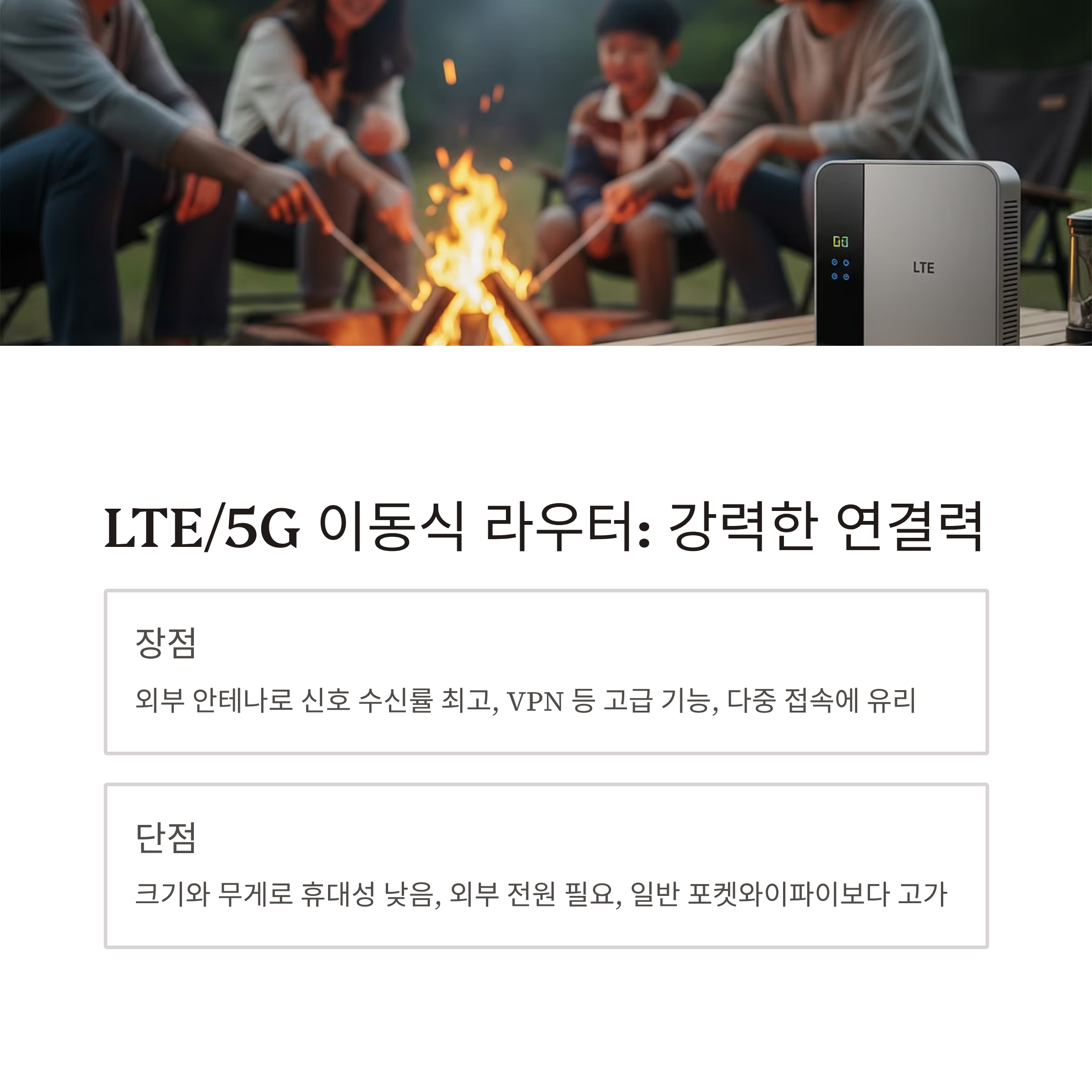 | 외곽 캠핑장, 차량 이동, 전원 불안정 지역 | LTE/5G SIM 라우터 | 신호 세기 강력, 다기기 연결 가능, 고정 사용 적합 |
