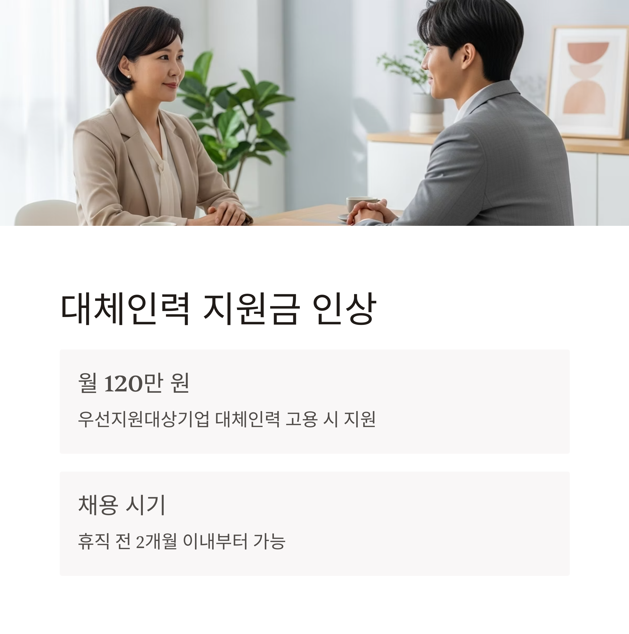 | 대체인력 지원금 | 30일 이상 대체인력 고용 시, 우선지원대상기업 | 월 120만 원 |