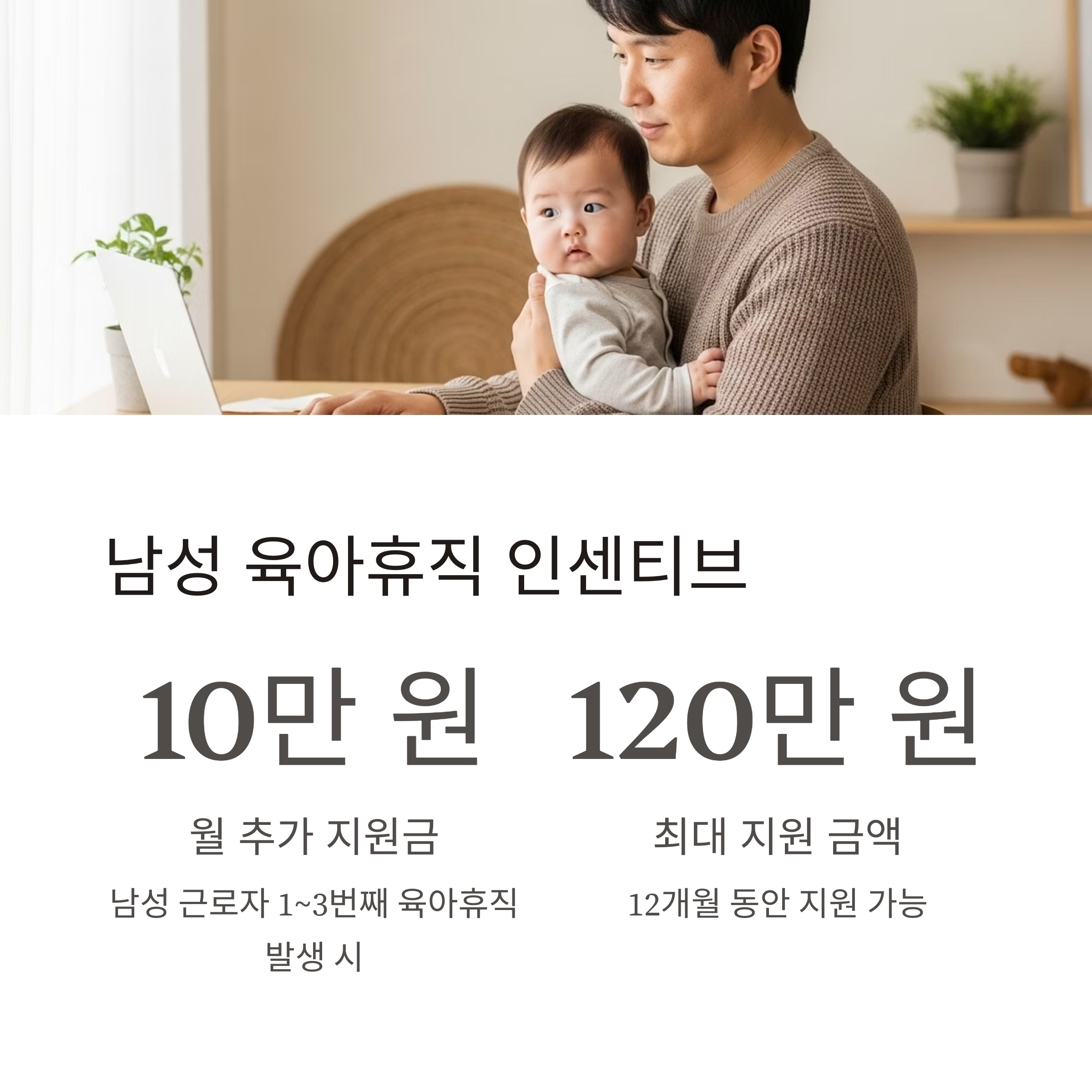 | 남성 근로자 1~3번째 육아휴직 발생 시 | 매월 10만 원 (최대 12개월/120만 원) |