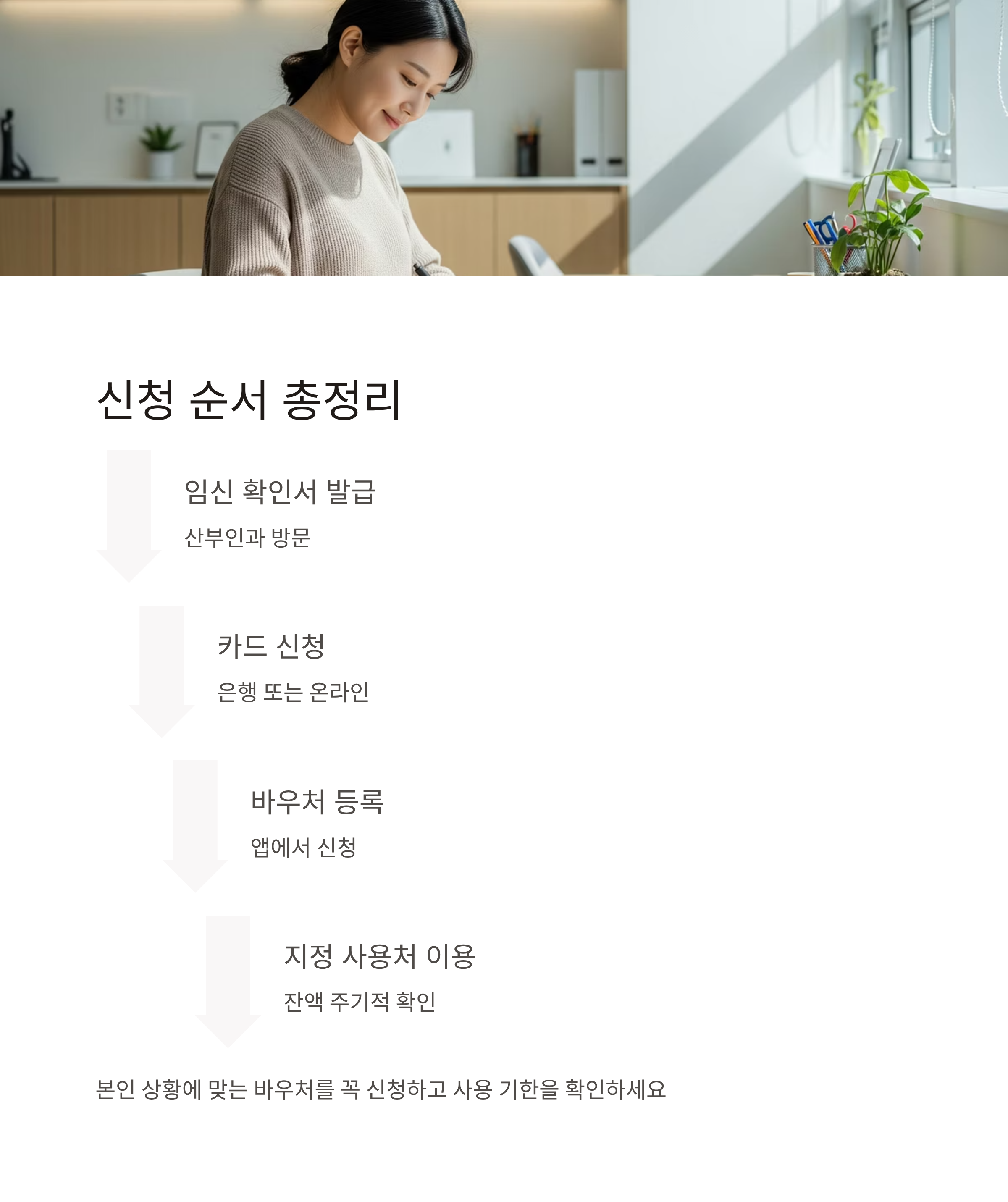 산부인과 등 요양기관에서 임신 정보가 건강보험공단이나 바우처 시스템에 등록돼야 합니다. 이후 카드사 앱이나 국민행복카드 포털에서 원하는 바우처를 신청·등록해야 사용할 수 있습니다. 일부 바우처는 정부24, 복지로를 통해 별도 신청이 필요합니다.
