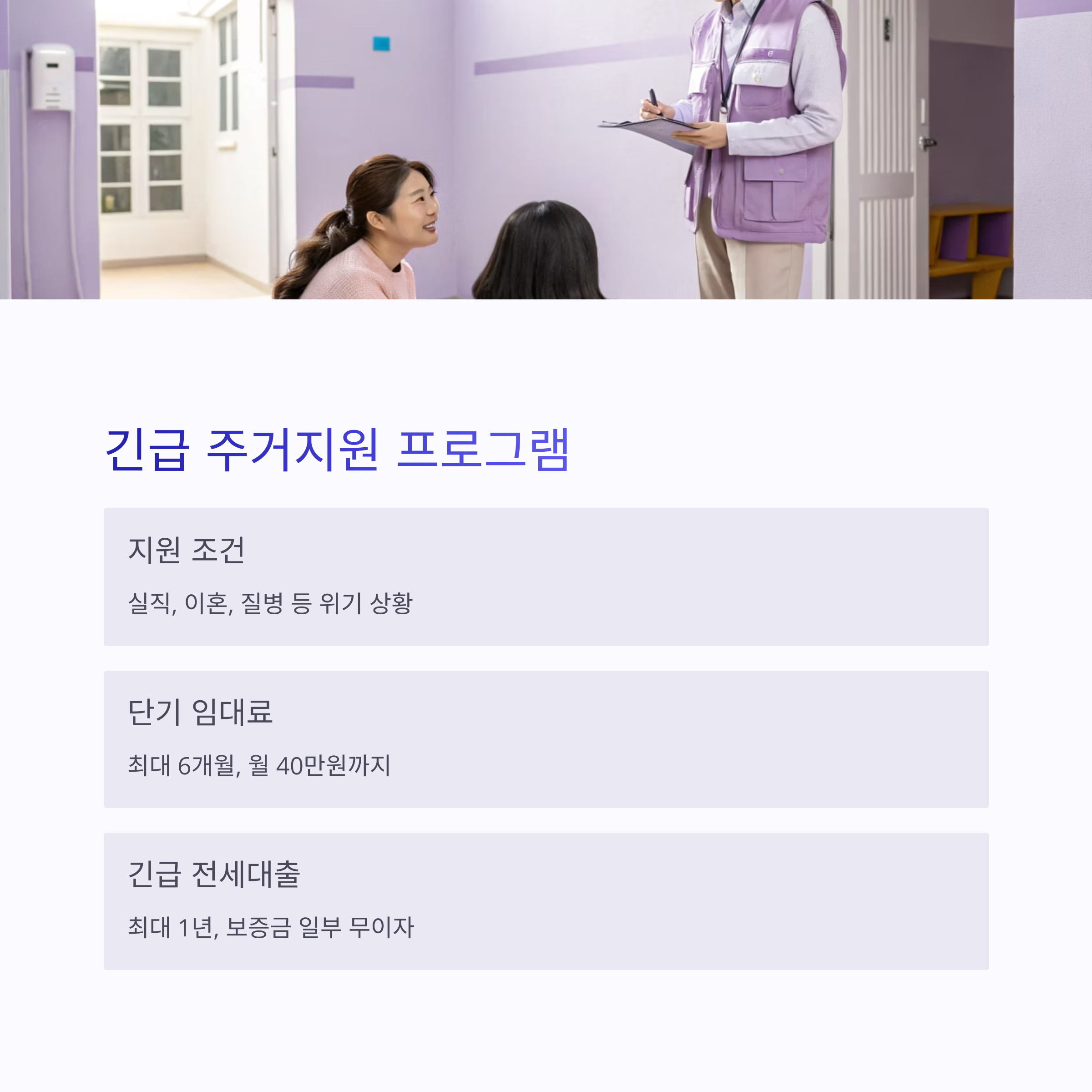| 단기 임대료 | 최대 6개월 | 지역별 기준 최대 월 40만 원 |