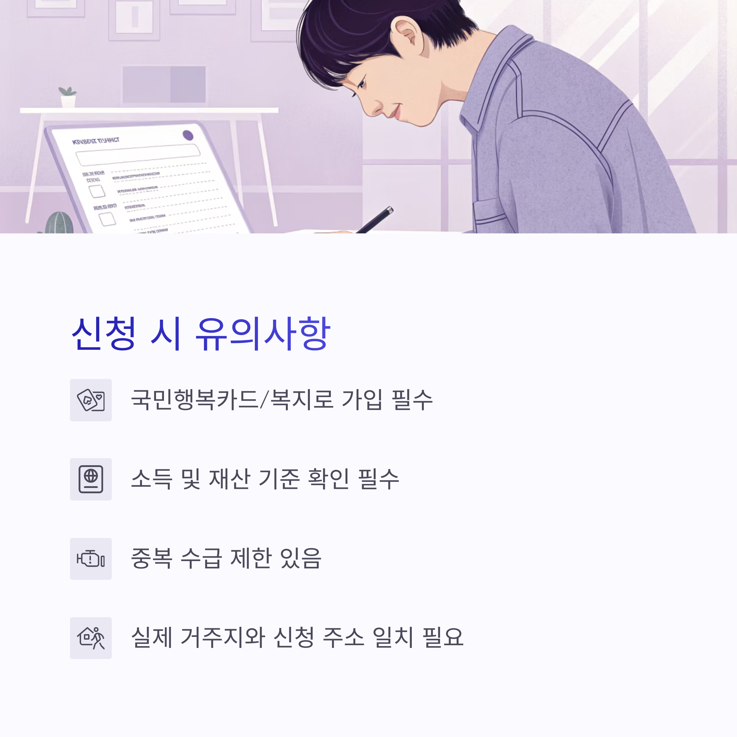 - 가구원 수, 소득 및 재산 기준 확인 필수