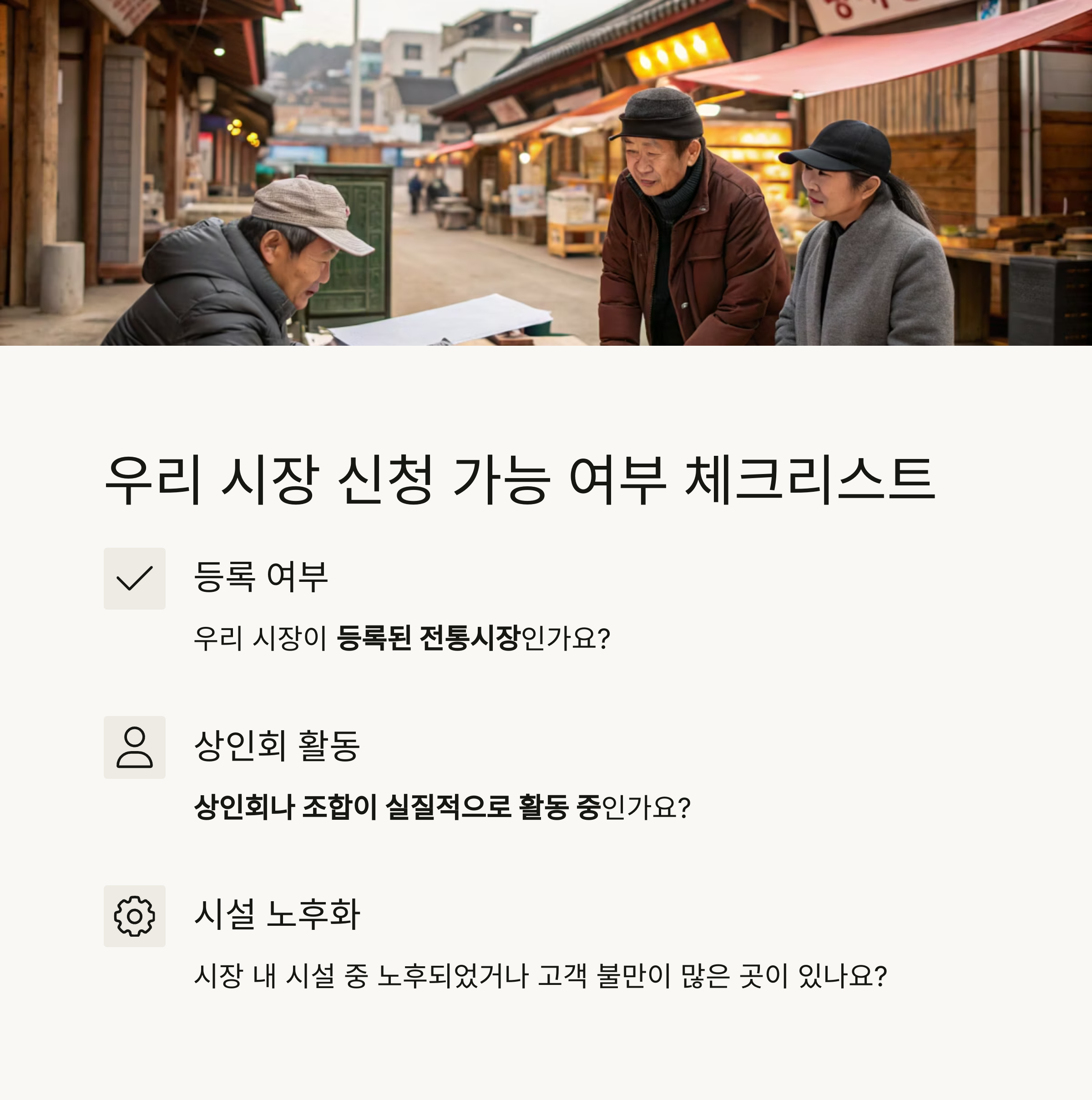 우리 시장이 등록되어 있고, 상인회가 있다면 기본 조건은 통과한 셈입니다.