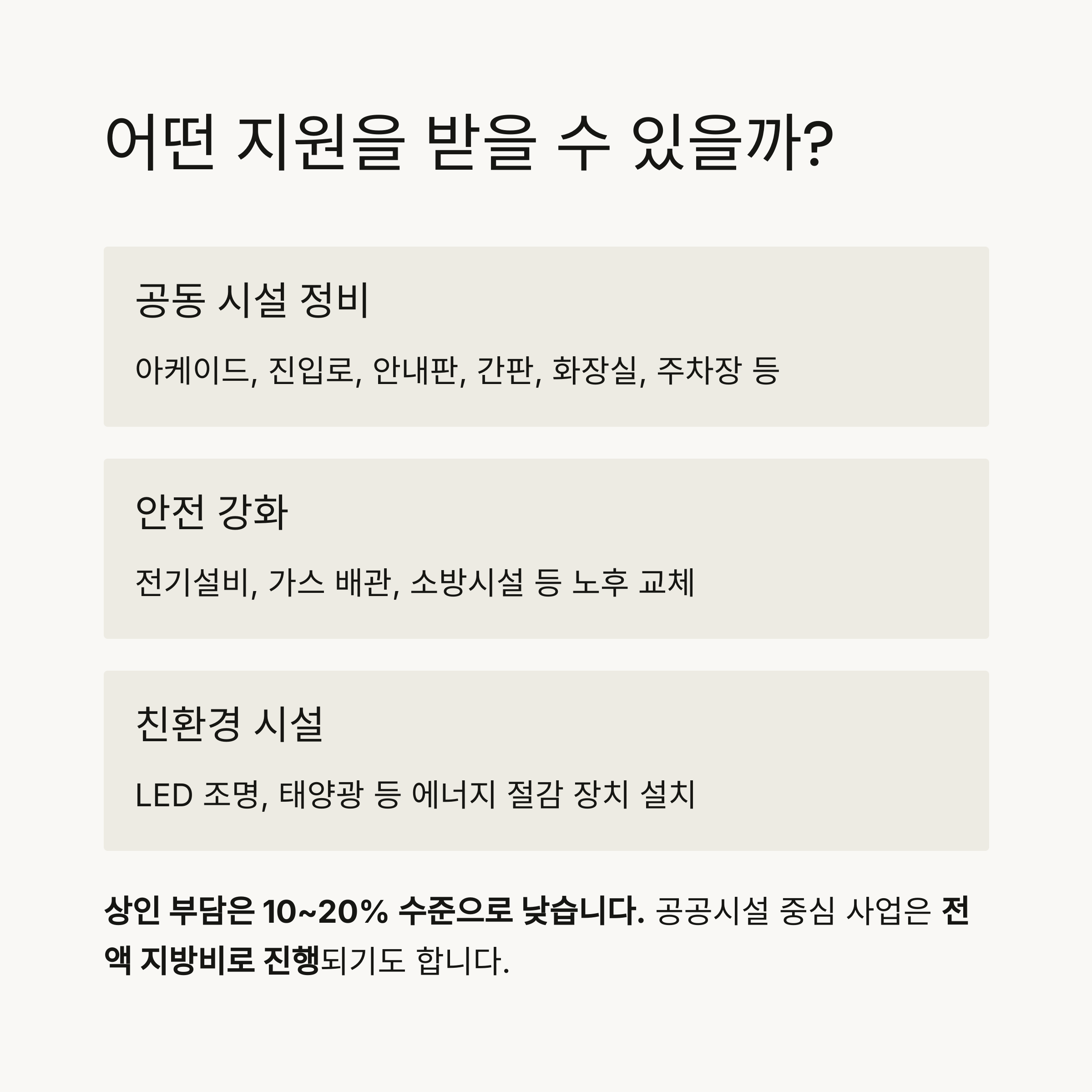 공공시설 중심 사업은 전액 지방비로 진행되기도 하니 부담 없이 참여 가능합니다.