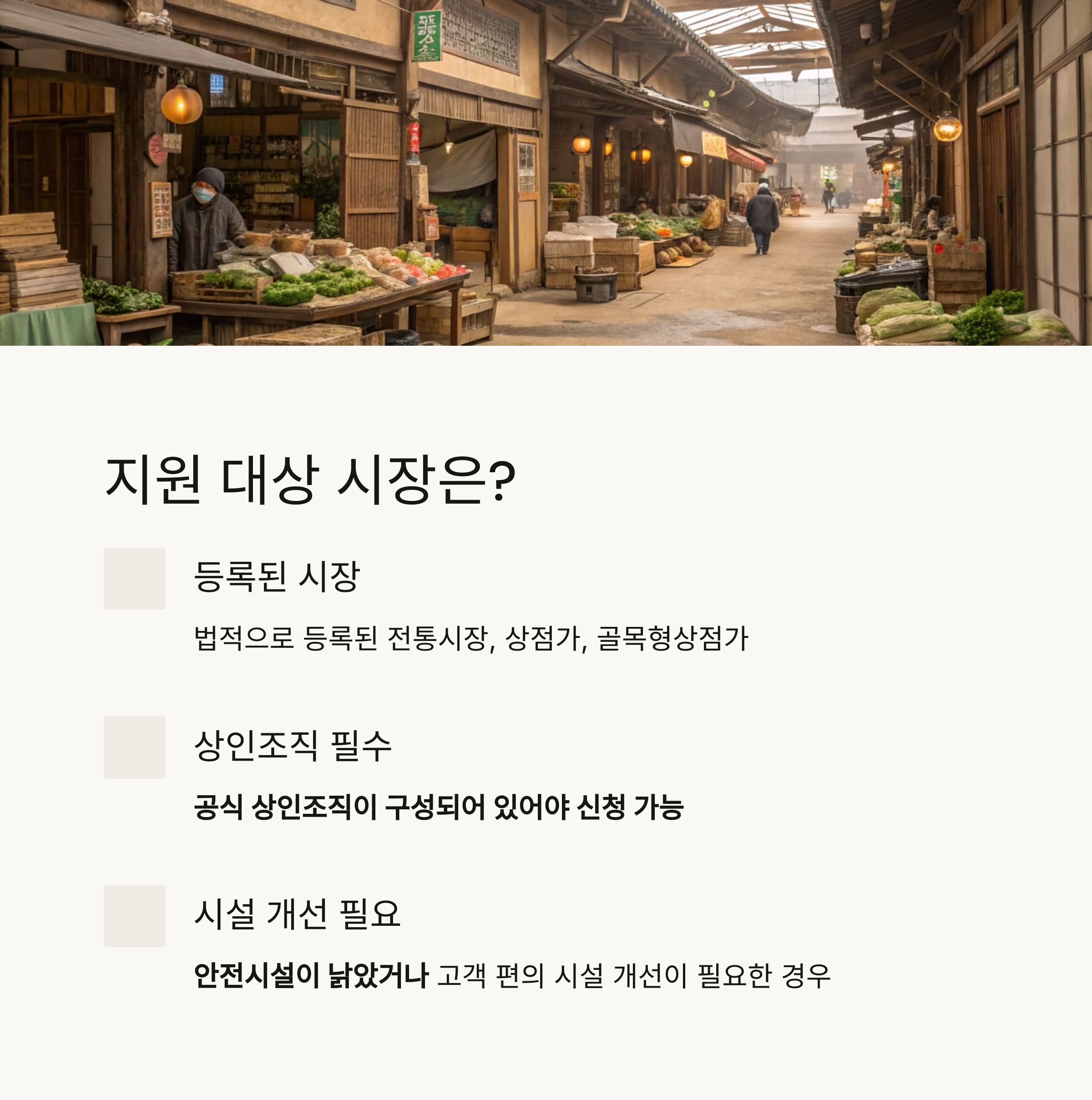 - 상인회나 조합 등 공식 상인조직이 구성되어 있어야 신청 가능