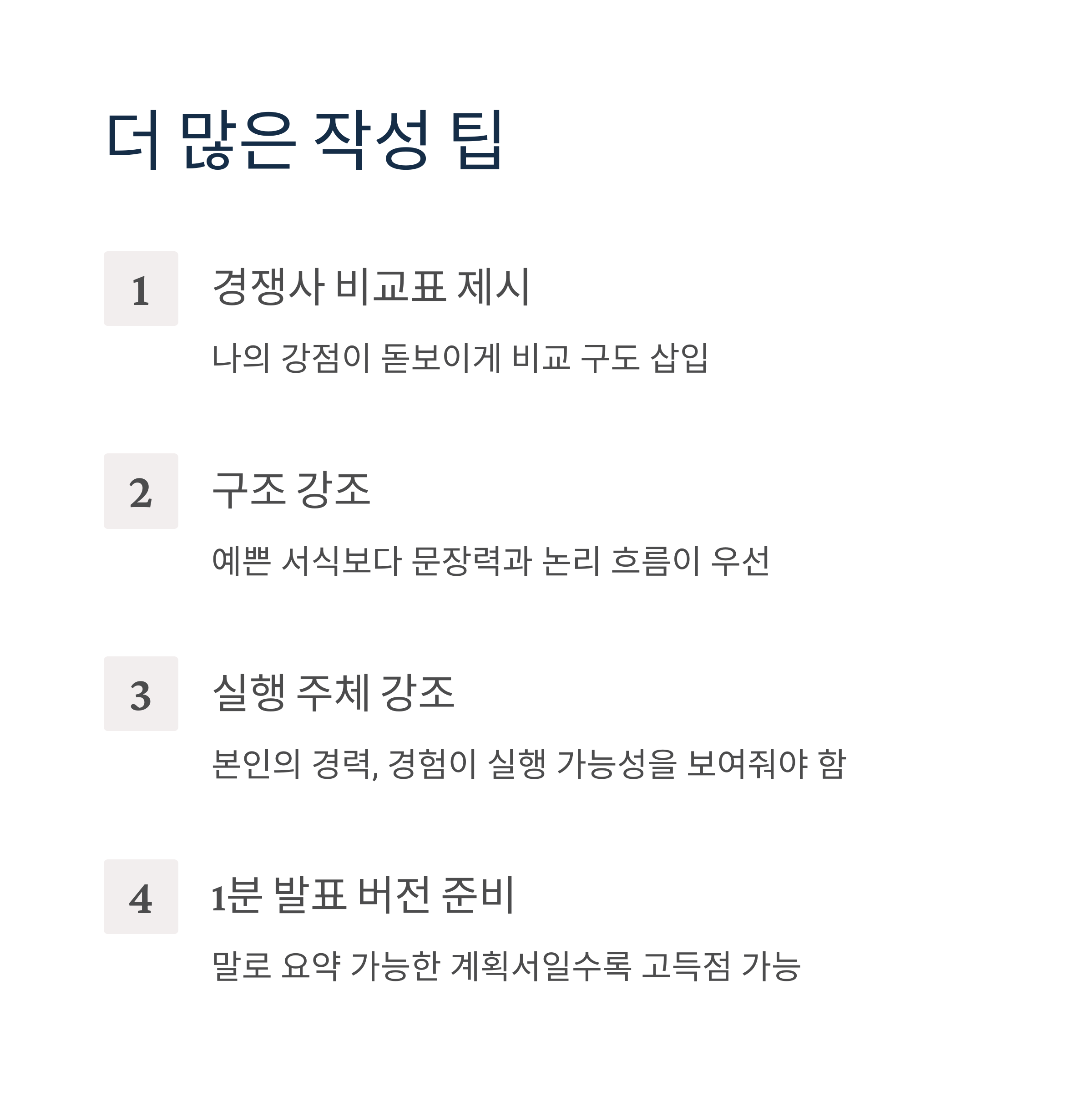- 실행 주체 강조: 본인의 경력, 경험, 협력 인프라가 ‘실행 가능성’을 보여줘야 함