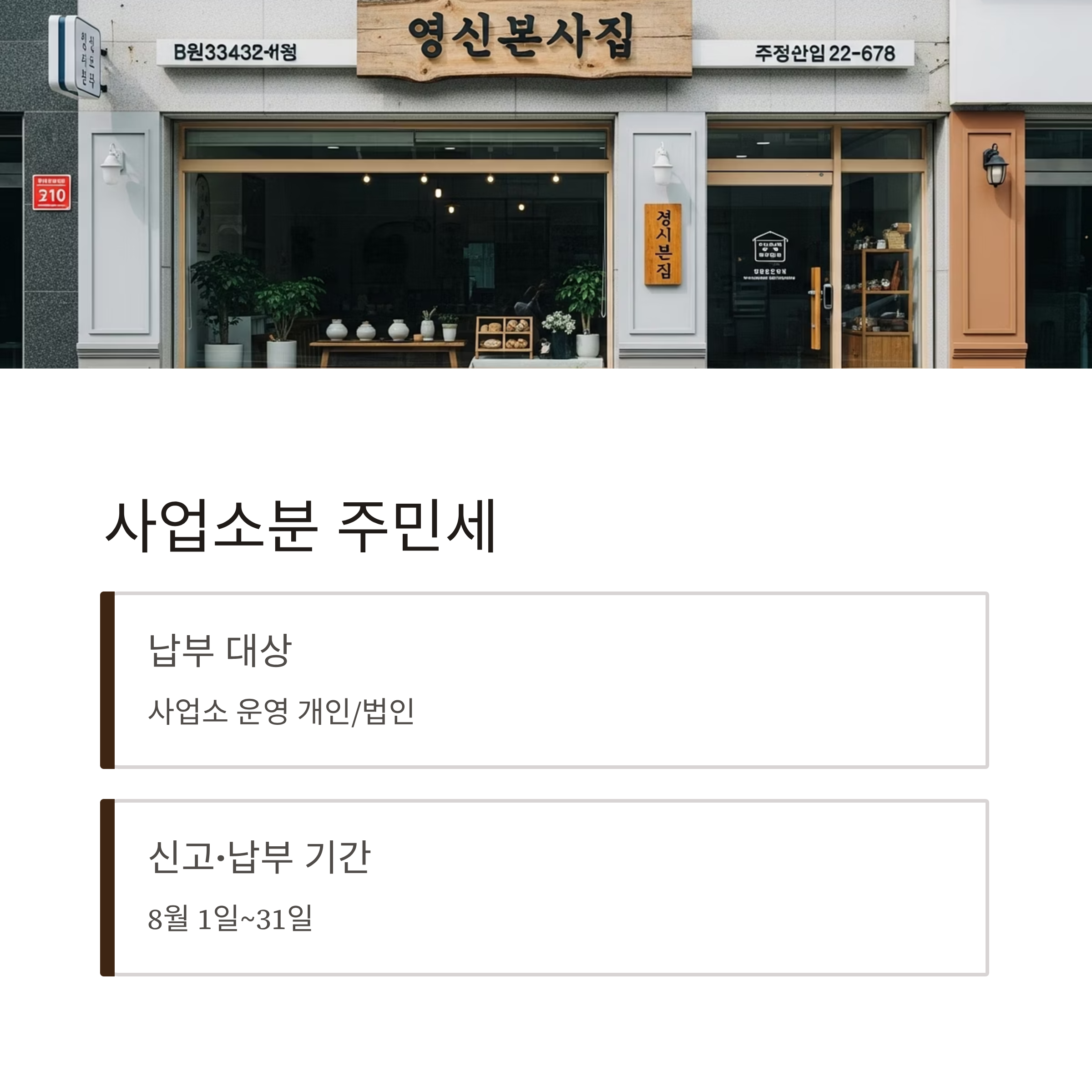 | 사업소분 주민세 | 2025년 8월 1일 ~ 8월 31일 | 위택스 신고 및 납부 또는 관할 구청 신고 |