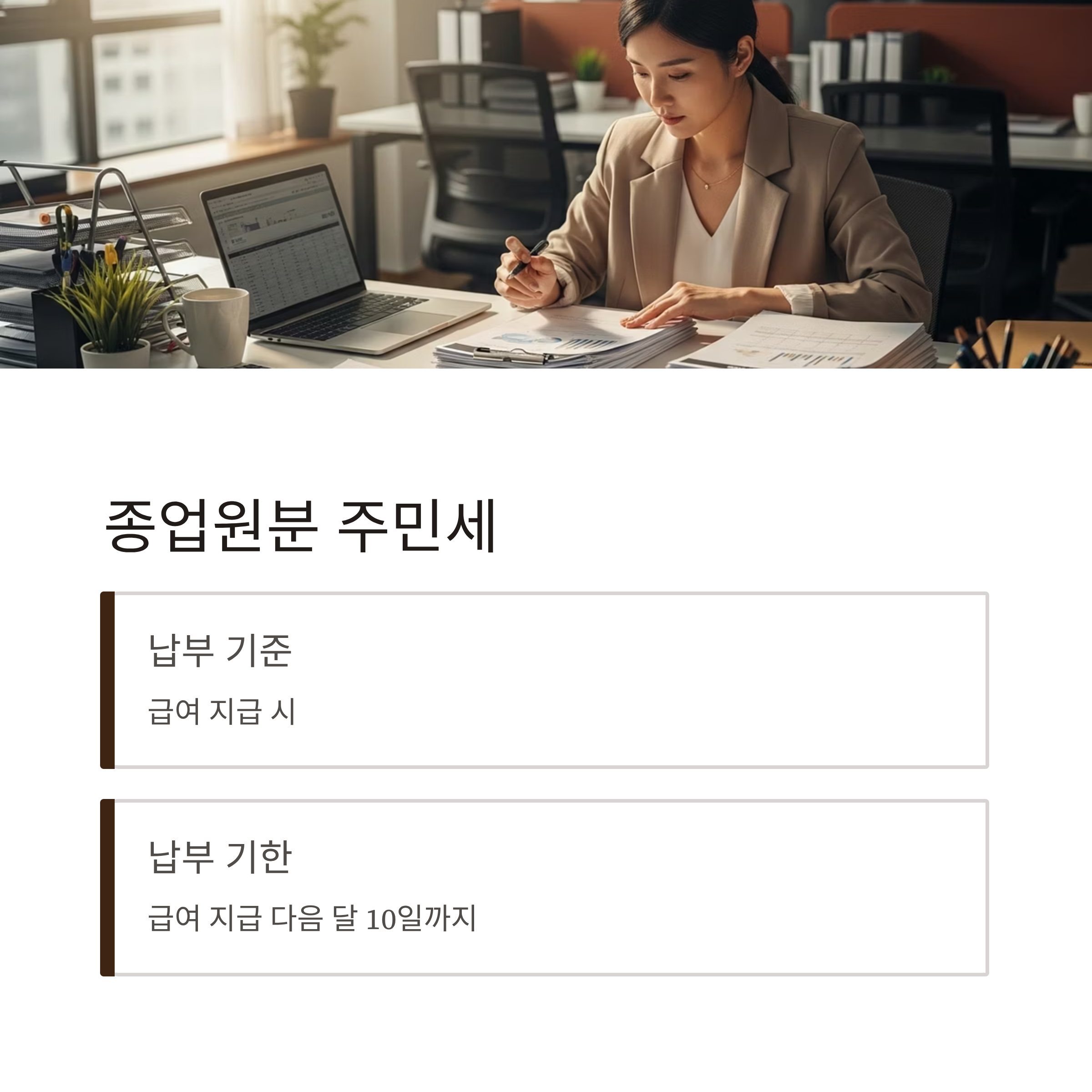 | 종업원분 주민세 | 급여 지급 다음 달 10일까지 | 위택스 신고 또는 자치단체 직접 신고·납부 |