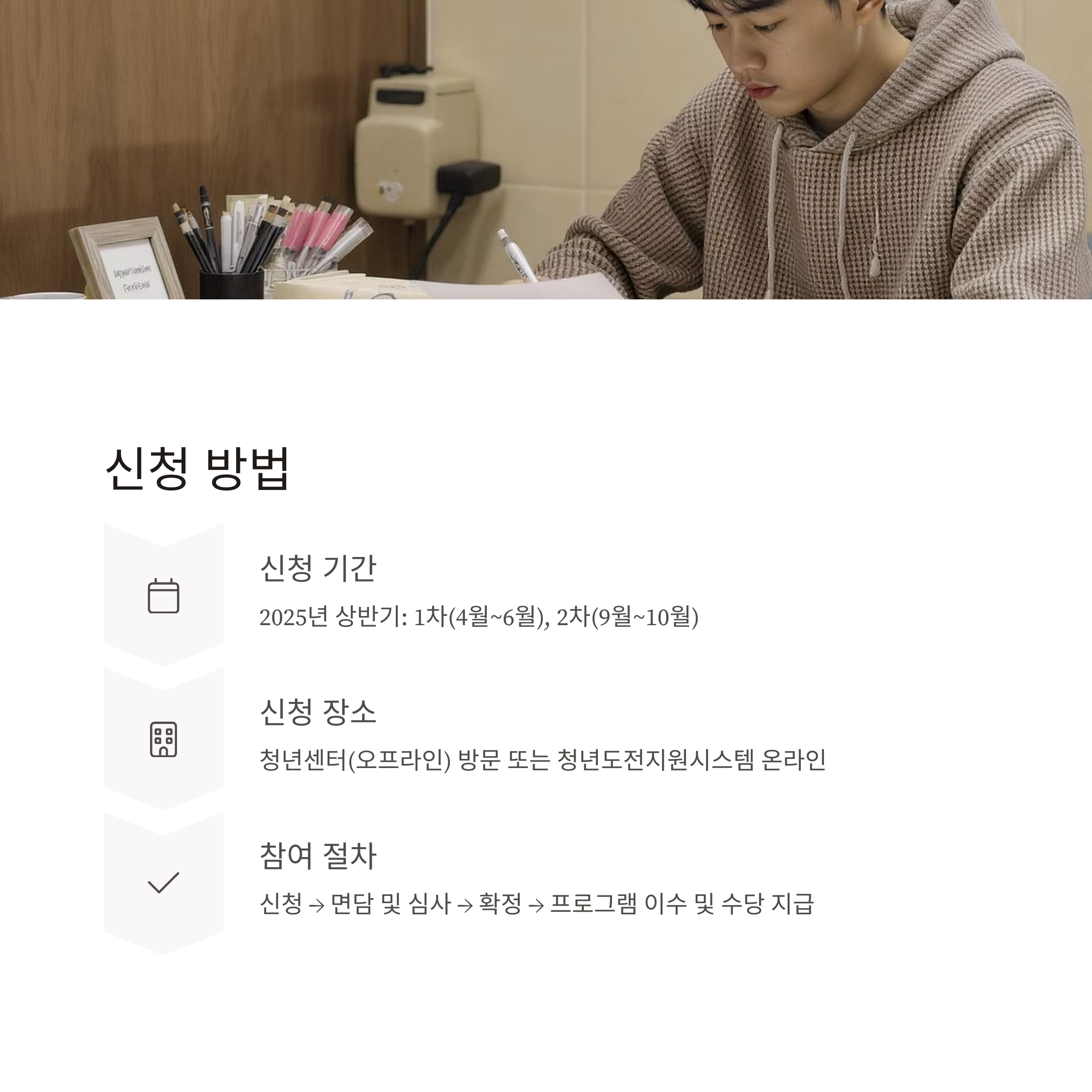 | 신청 방법 | 청년센터(오프라인) 방문 또는 청년도전지원시스템 온라인 접수 |