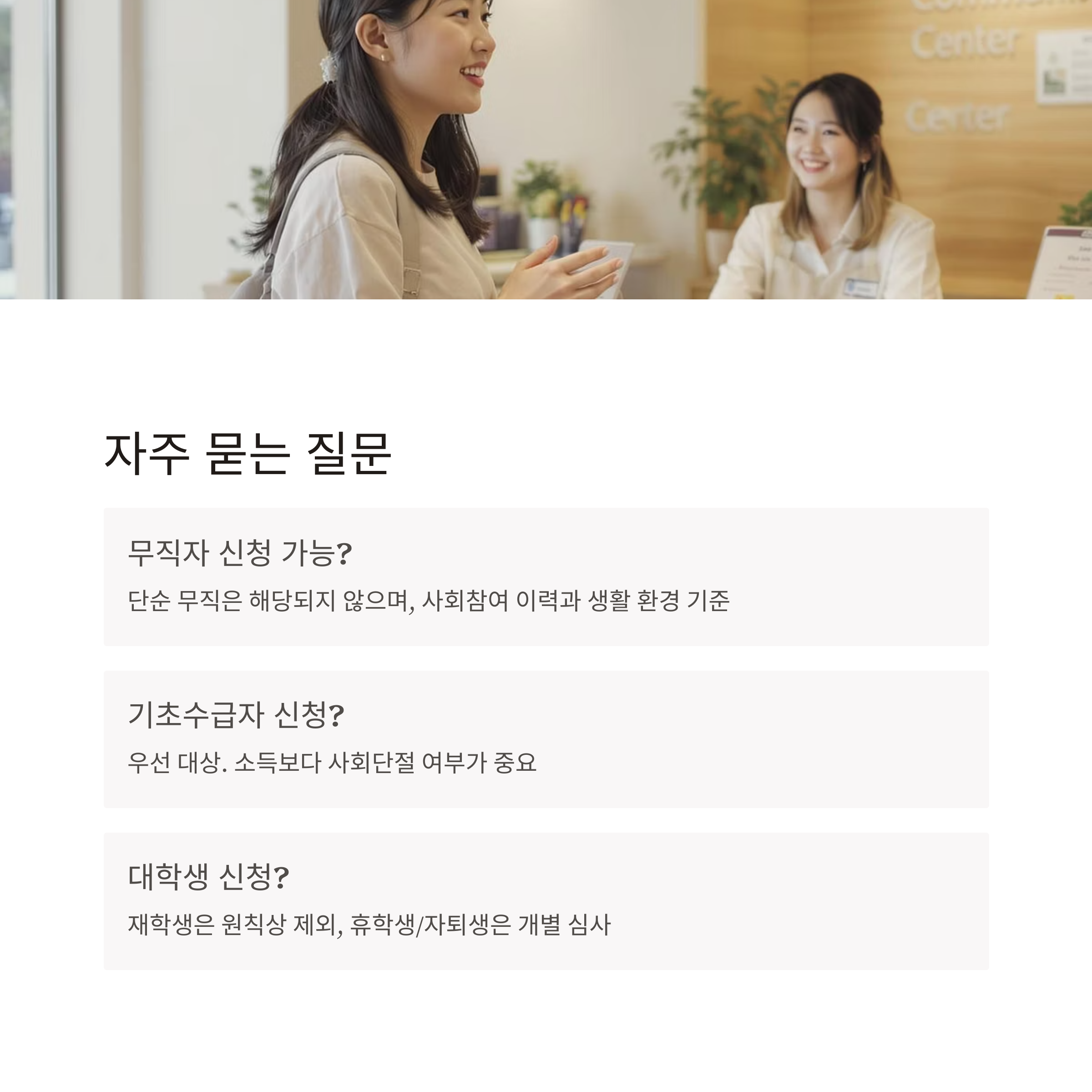 대학생도 신청 가능한가요? 재학생은 원칙상 제외되며, 휴학생 또는 자퇴 청년은 개별 심사로 가능할 수 있습니다.