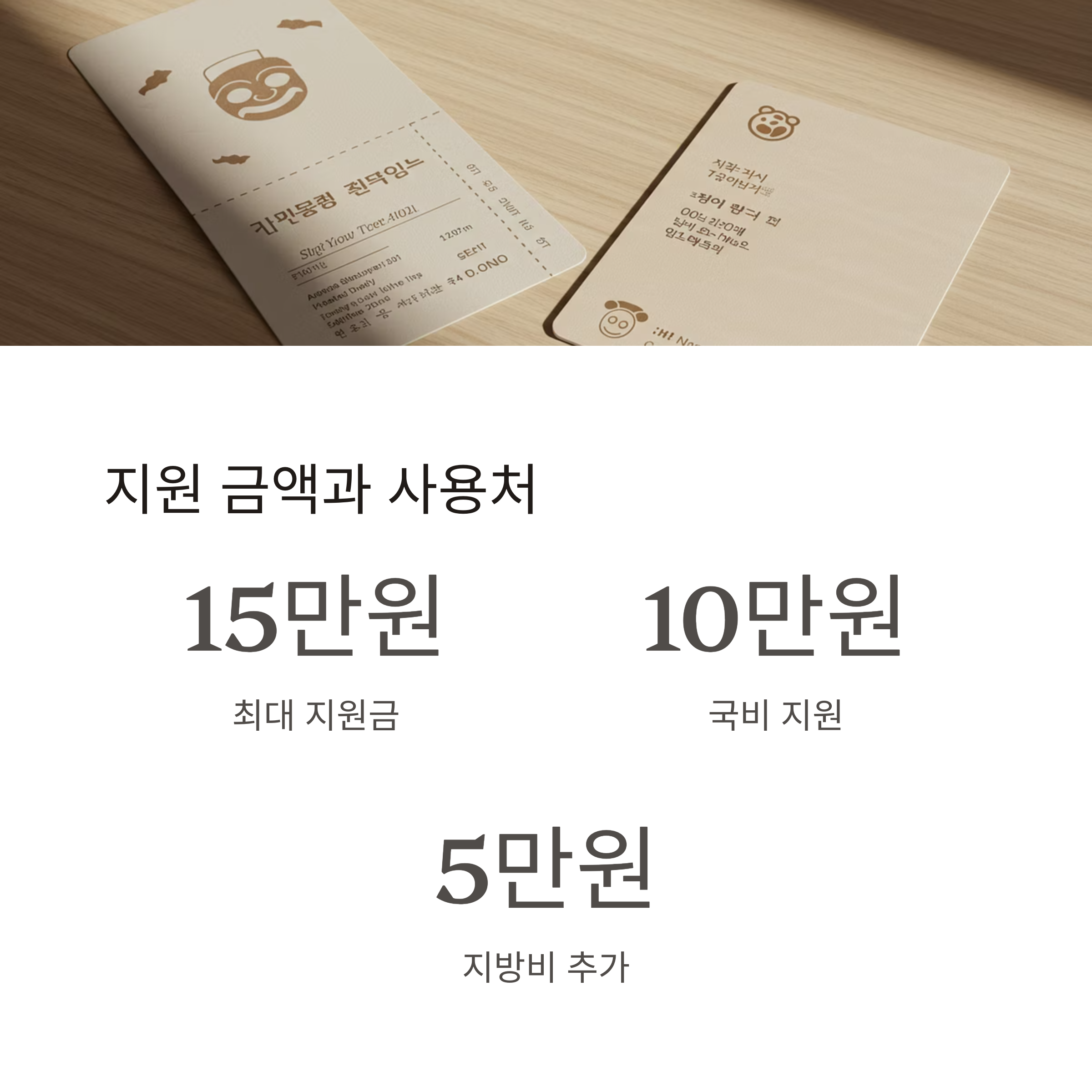 | 지원 내용 | 1인당 최대 15만 원(국비 10만 원 + 지방비 5만 원) |
