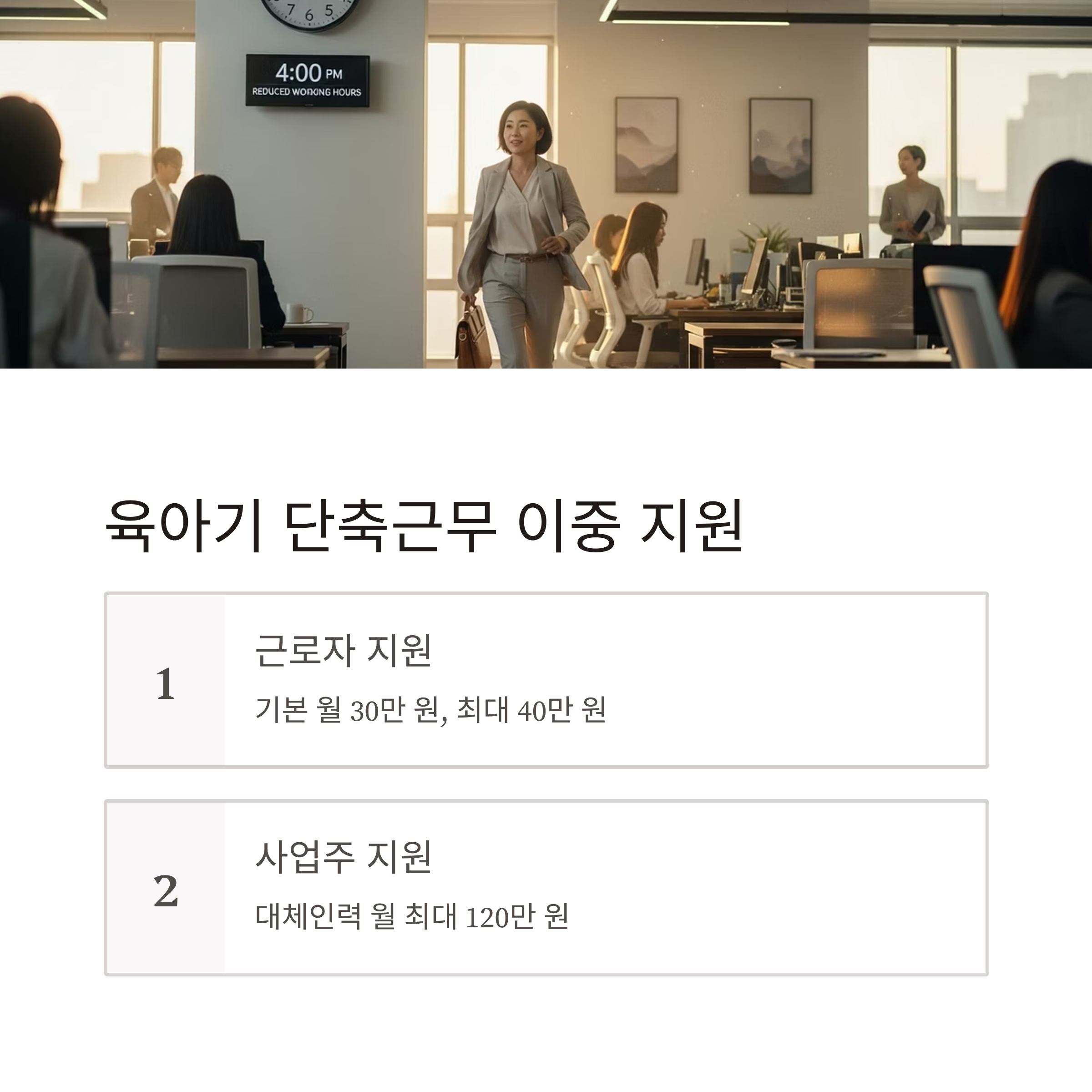 | 육아기 단축근무 지원금 | 단축근무자 | 월 30만 원(기본) | 최대 월 40만 원 | 최소 1개월 단축, 12개월 내 신청 |