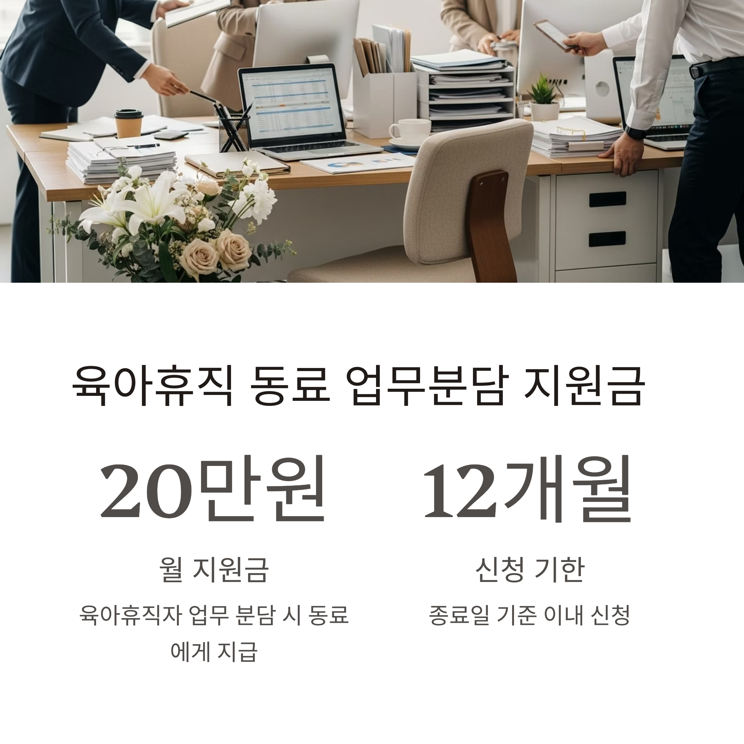 | 업무분담(동료) 지원금 | 육아휴직 근로자의 동료 | 1인당 월 20만 원 | 해당 없음 | 30일 이상 육아휴직 또는 단축 시 참여 |