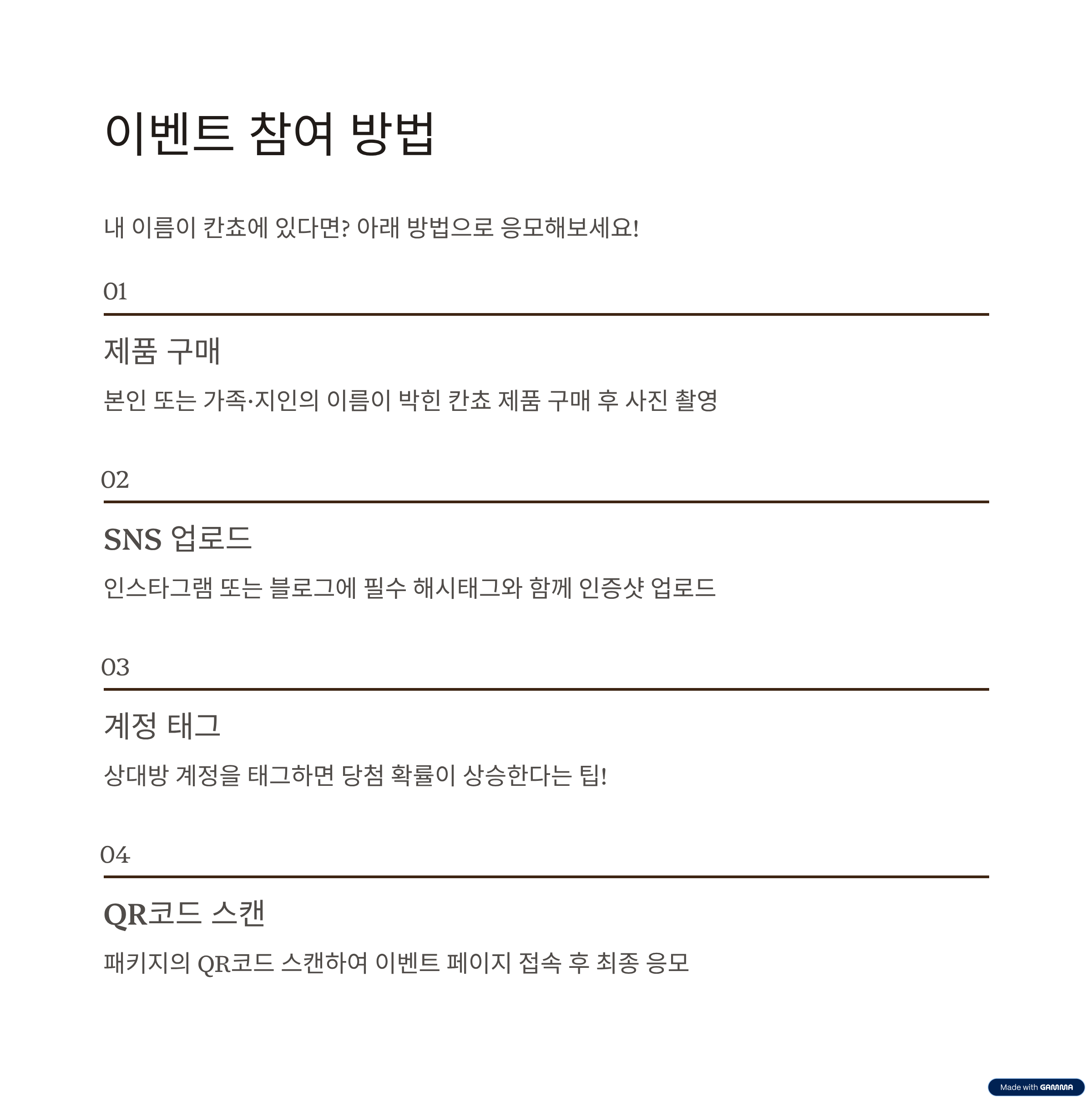 | 1단계 | 본인 또는 가족·지인의 이름이 박힌 칸쵸 제품 구매 후 사진 촬영 |