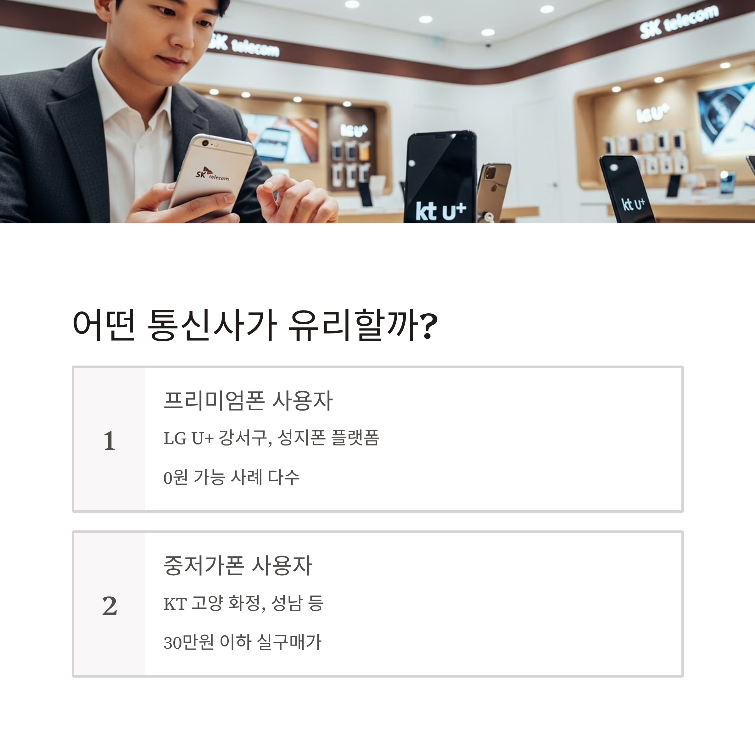 | 프리미엄폰 사용자 | LG U+ | 강서구, 성지폰 플랫폼 | 0원 가능 사례 다수 |