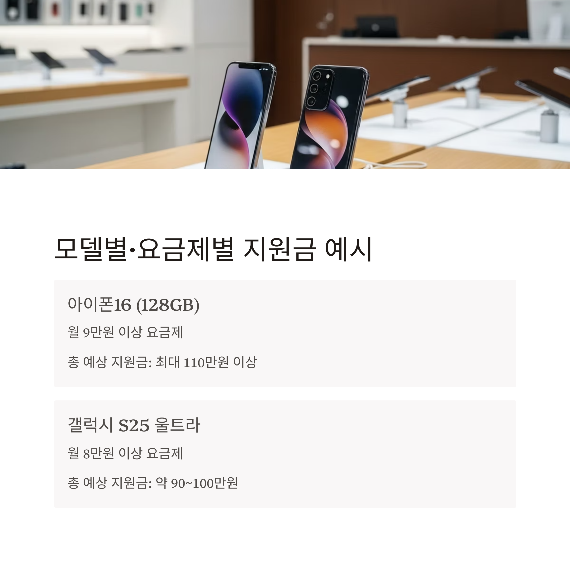 | 갤럭시 S25 울트라 | 월 8만 원 이상 요금제 | 50만 원 | 40~50만 원 | 약 90~100만 원 |