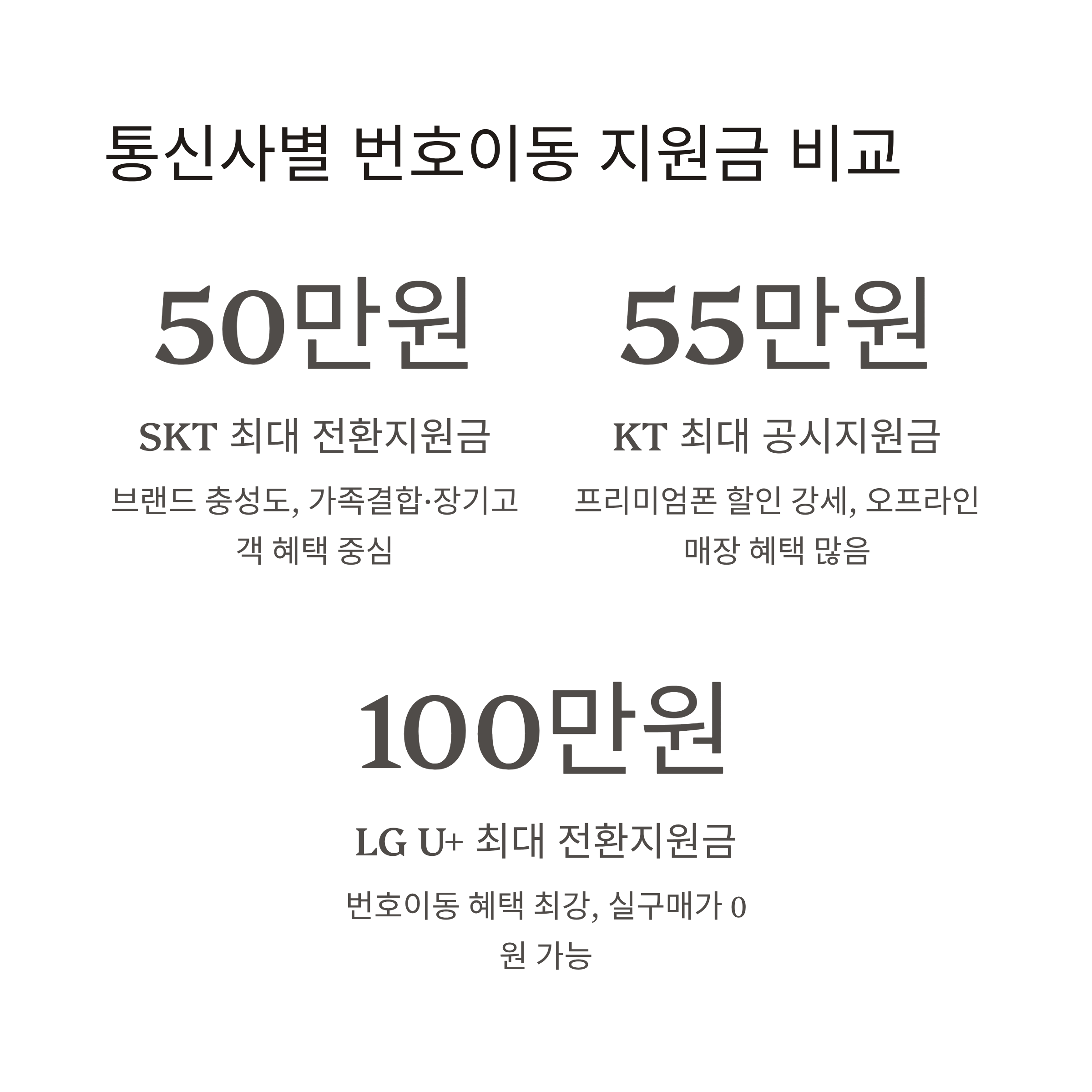 | SKT | 35만~50만 원 | 최대 50만 원 수준 | 브랜드 충성도, 가족결합·장기고객 혜택 중심 |