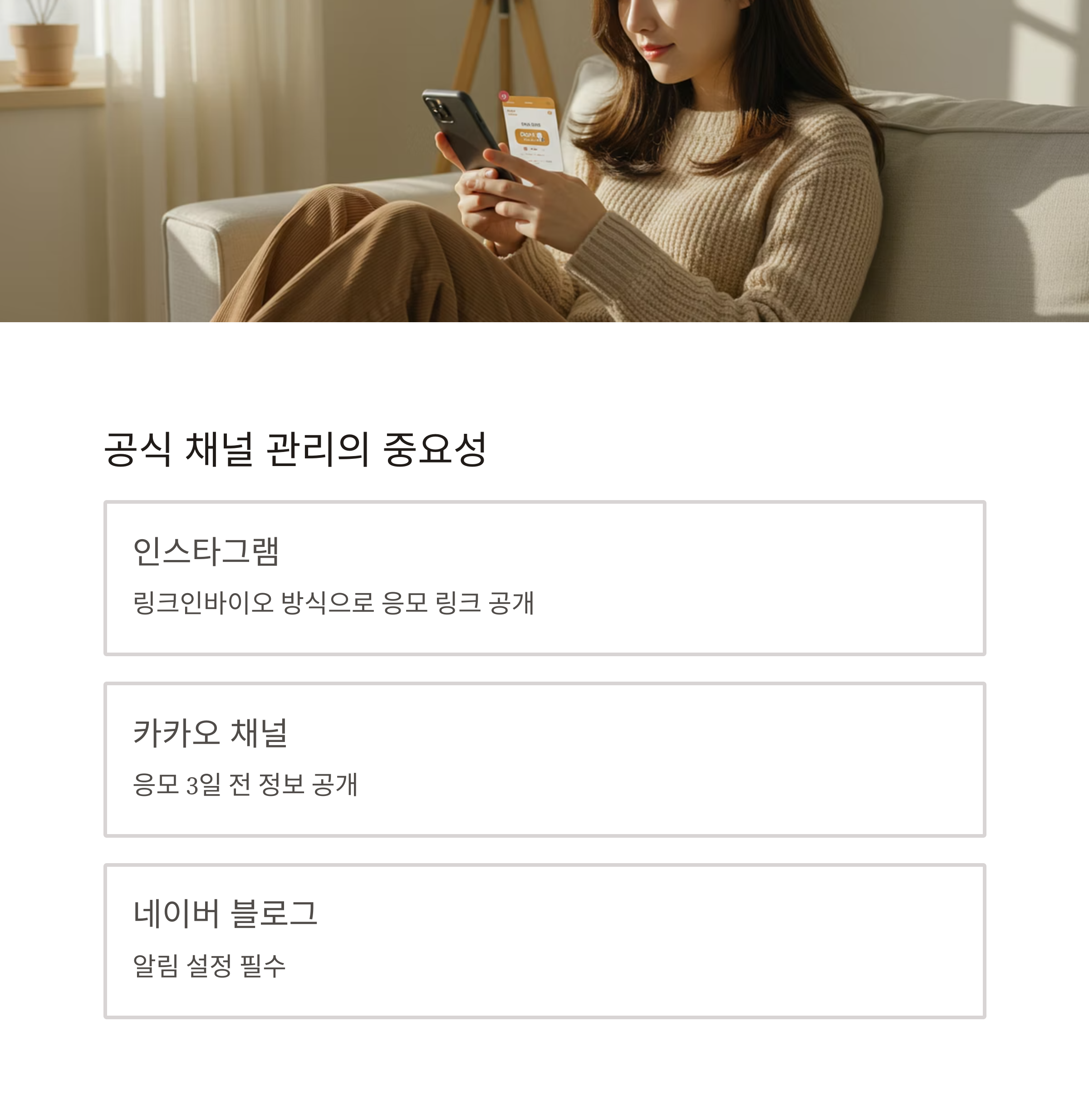 응모 공지는 인스타그램, 카카오 채널, 네이버 블로그를 통해 사전 공개됩니다.