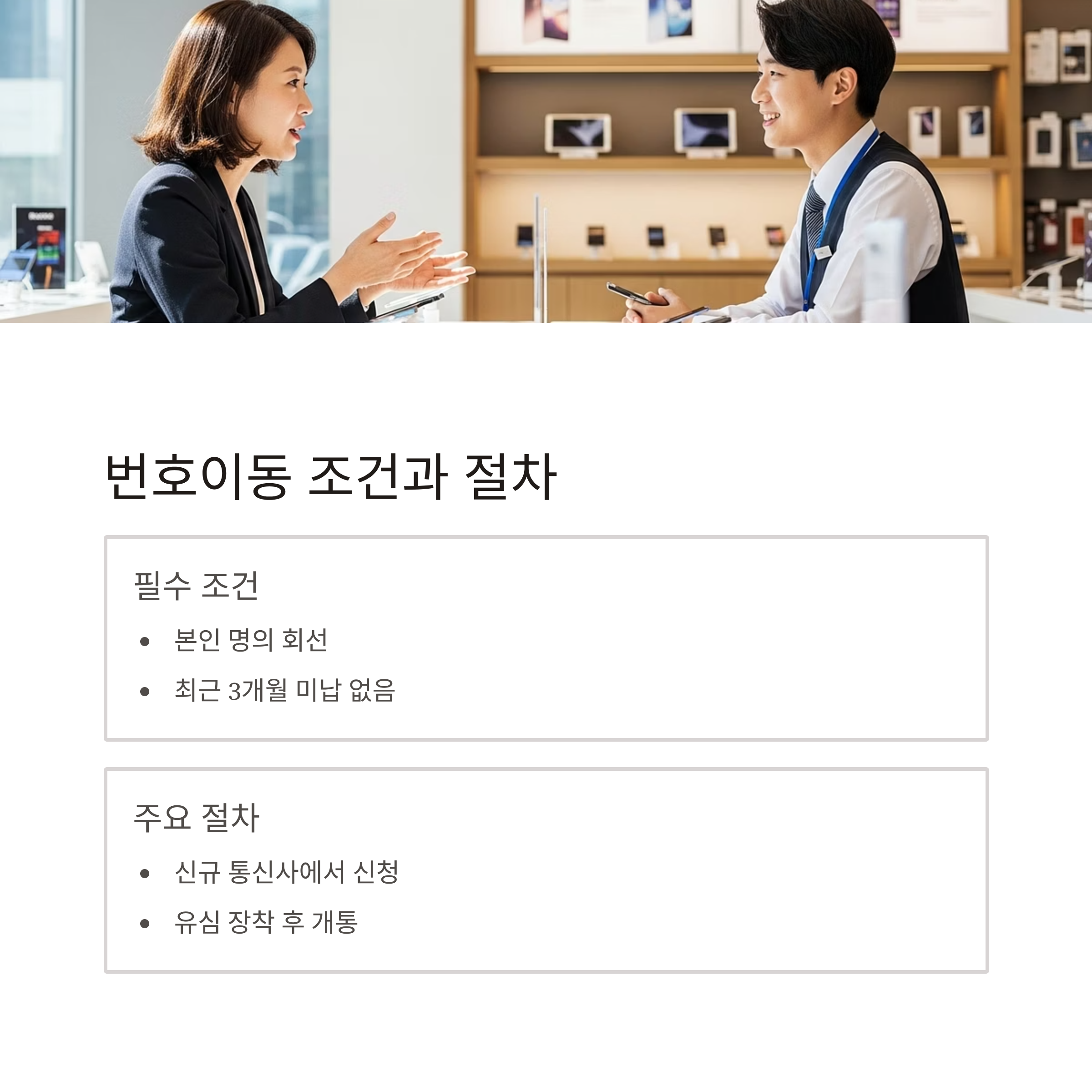 | 본인 명의 회선, 최근 3개월 미납 없음 | 신규 통신사에서 번호이동 신청 |