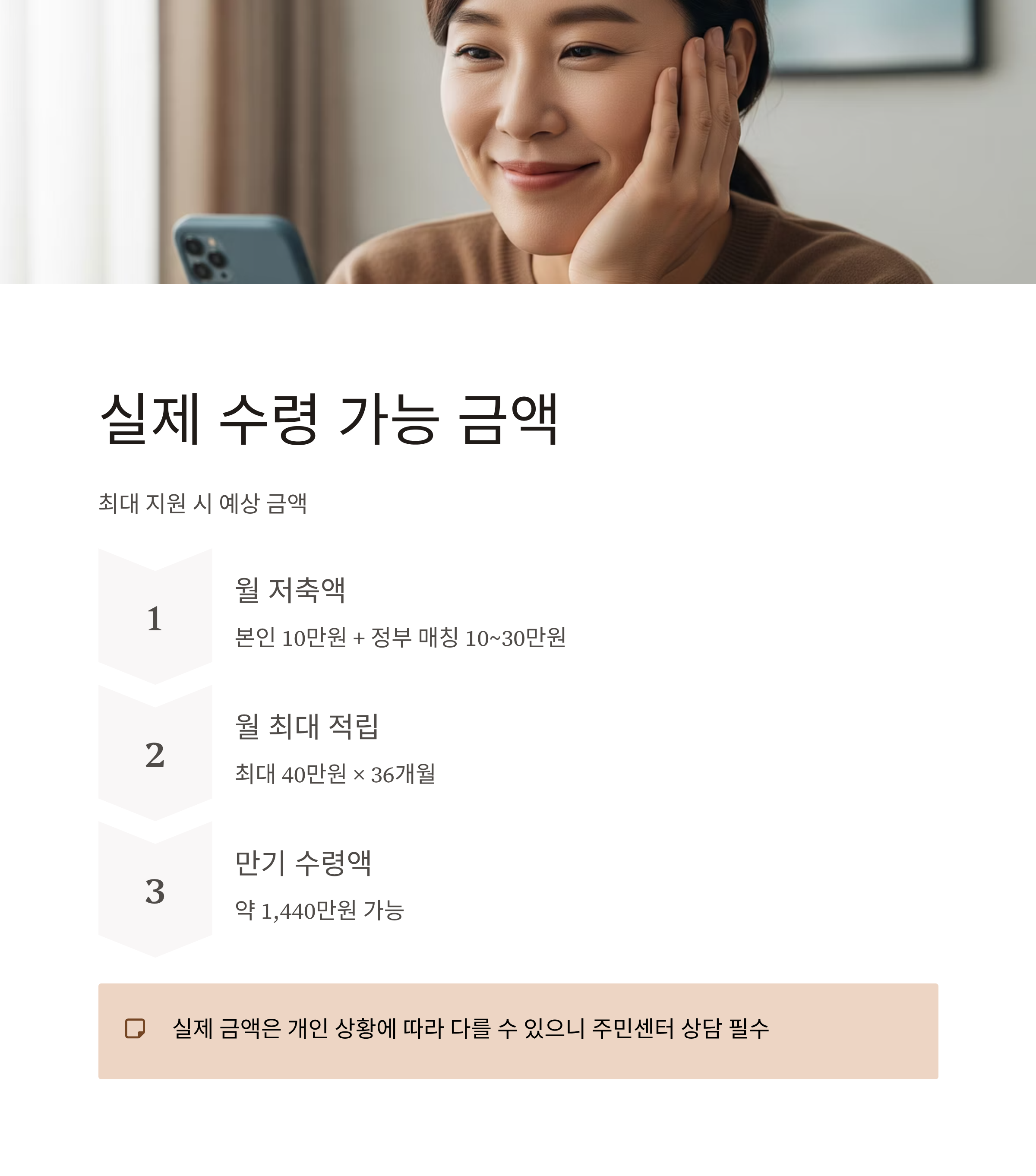 월 10만 원 + 정부 매칭 10~30만 원 → 월 최대 40만 원 × 36개월 = 약 1,440만 원 가능