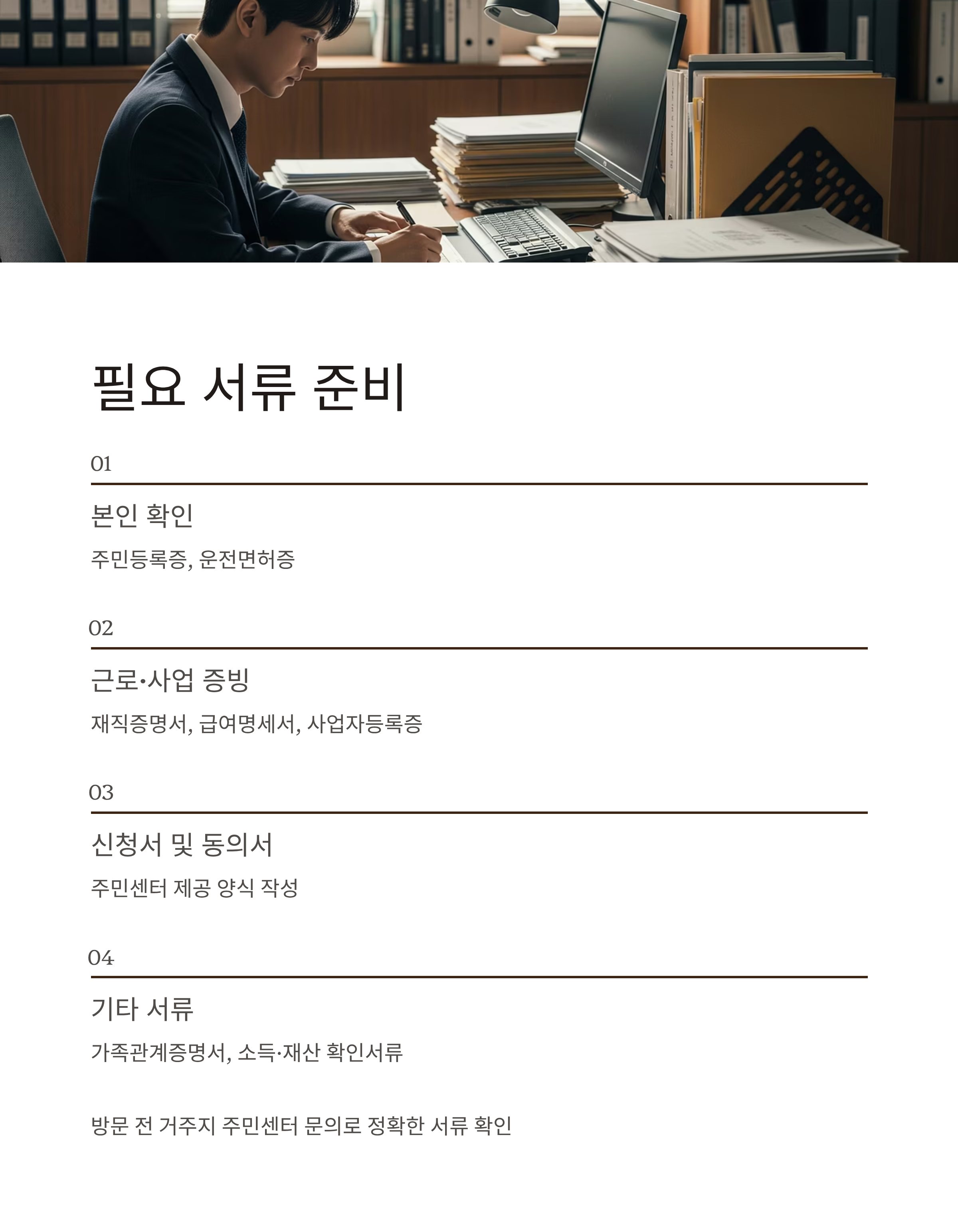 방문 전 거주지 주민센터에 문의하면, 동별로 필요한 서류 안내를 받을 수 있으니 참고하세요.