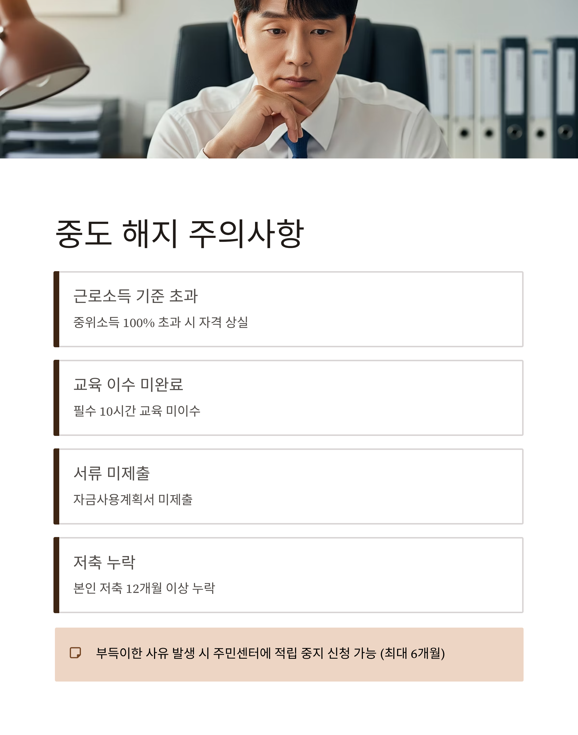 근로 소득 유지 조건 | 가입 후 근로·사업소득이 중위소득 100% 이하 유지 필요 |