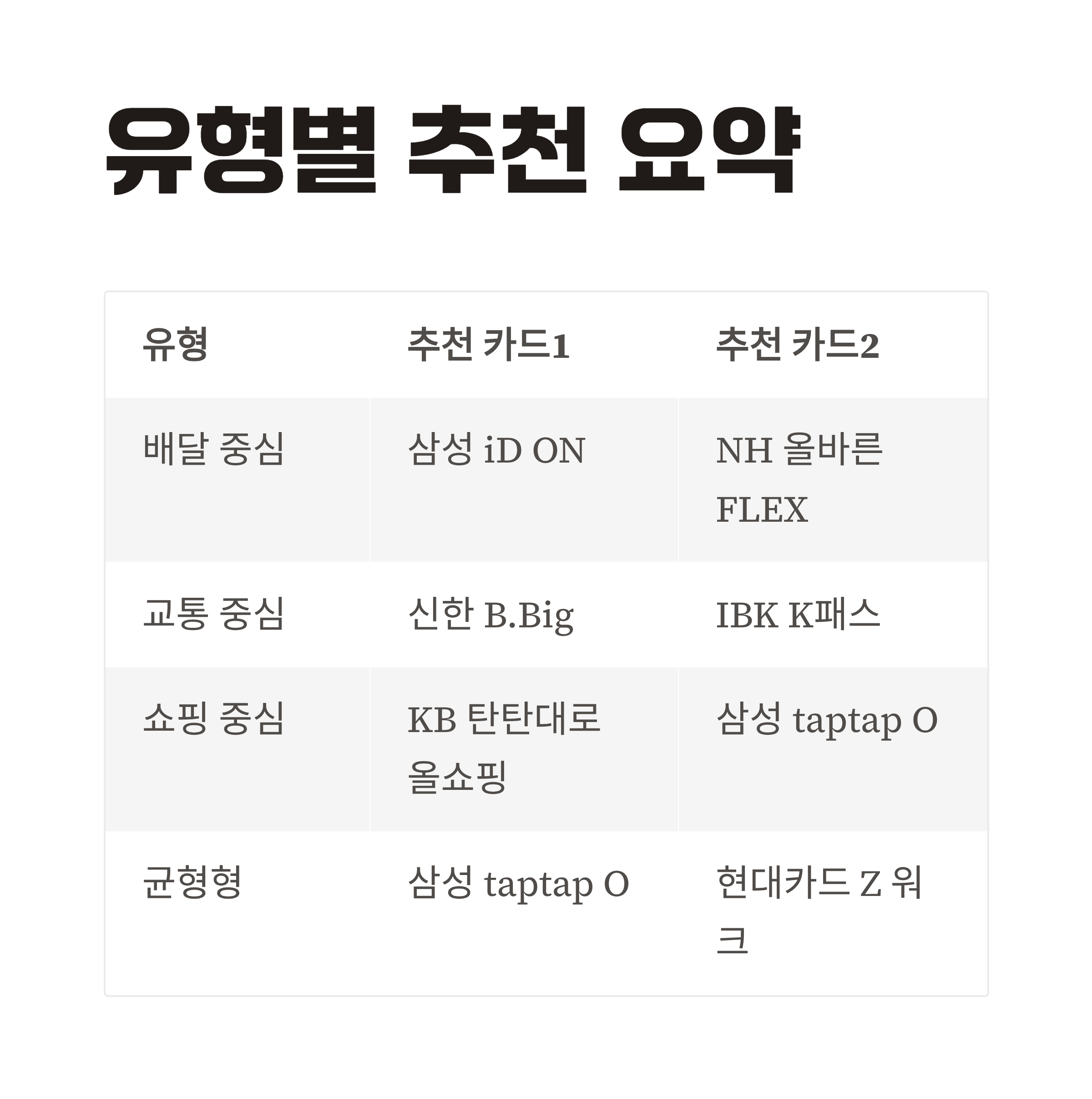 | 삼성 taptap O 카드 | 배달·커피·편의점·온라인쇼핑까지 생활 전방위 할인 | 할인 비율은 평균적이나 전체 밸런스가 뛰어난 카드 |