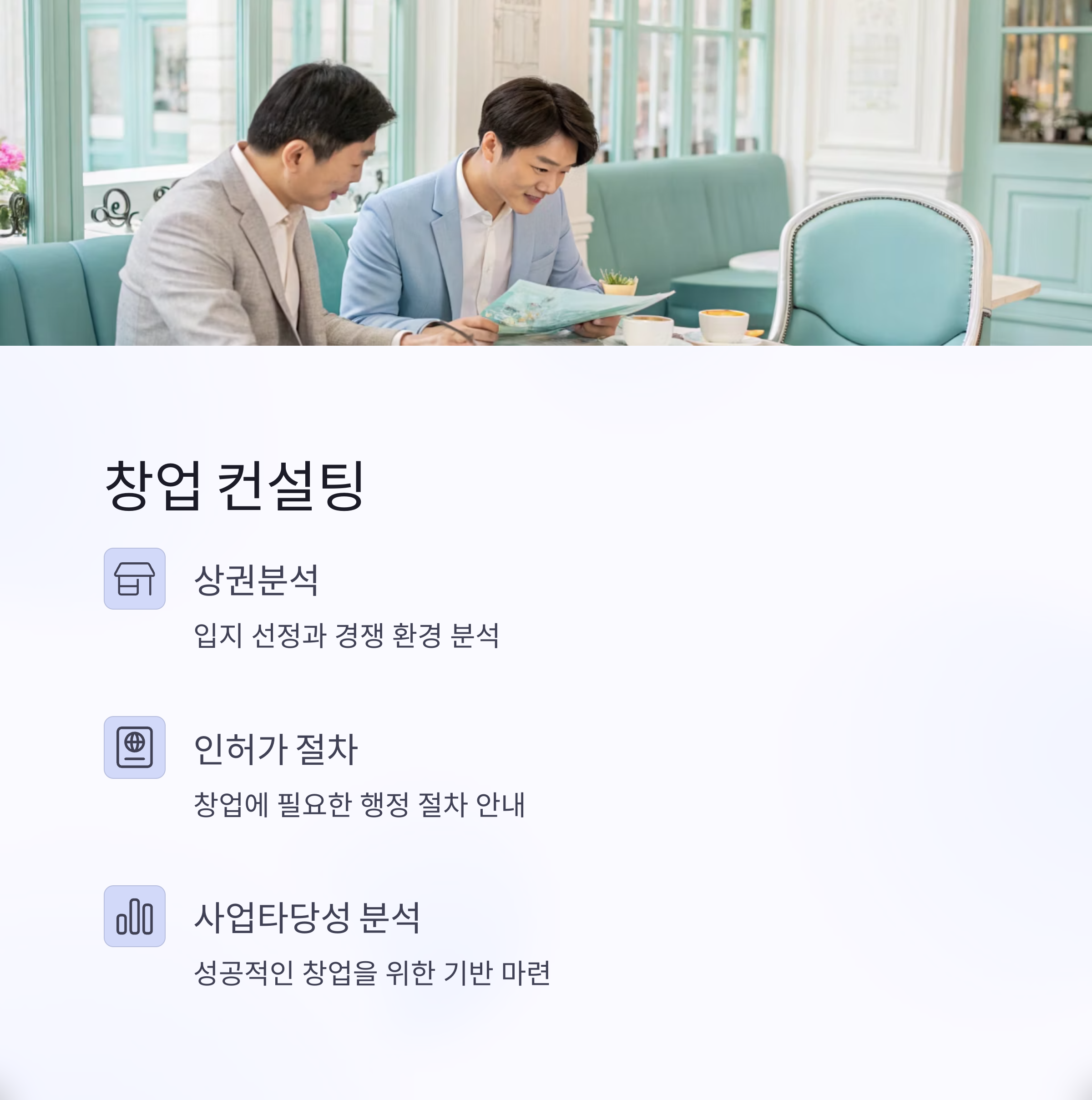 예비창업자를 대상으로 상권분석, 창업 트렌드, 인허가 절차, 사업타당성 분석 등 창업 전반에 대한 컨설팅을 제공합니다. 이를 통해 성공적인 창업을 위한 기반을 마련할 수 있습니다.