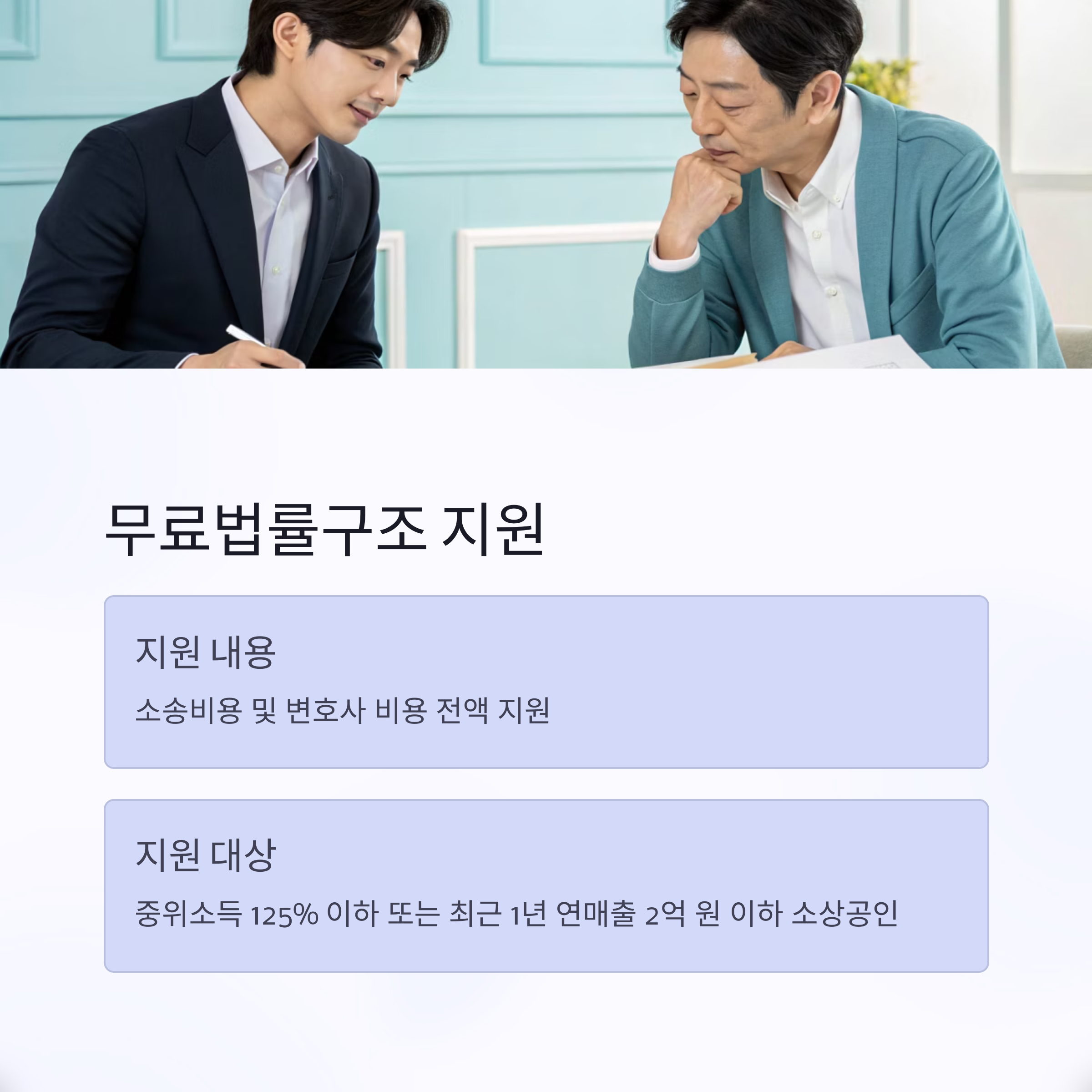 영업활동 중 발생하는 민사사건에 대해 대한법률구조공단을 통해 소송비용 및 변호사 비용을 전액 지원받을 수 있습니다. 지원 대상은 중위소득 125% 이하 또는 최근 1년 연매출 2억 원 이하의 소상공인입니다.
