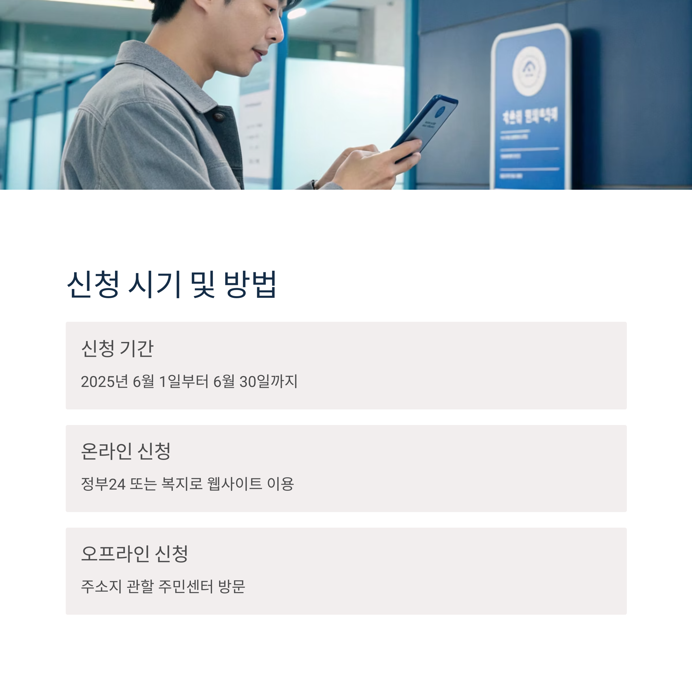 - 오프라인 신청: 주민등록상 주소지 관할 주민센터 방문 신청(행정안전부, 복지로, 네이버 블로그)