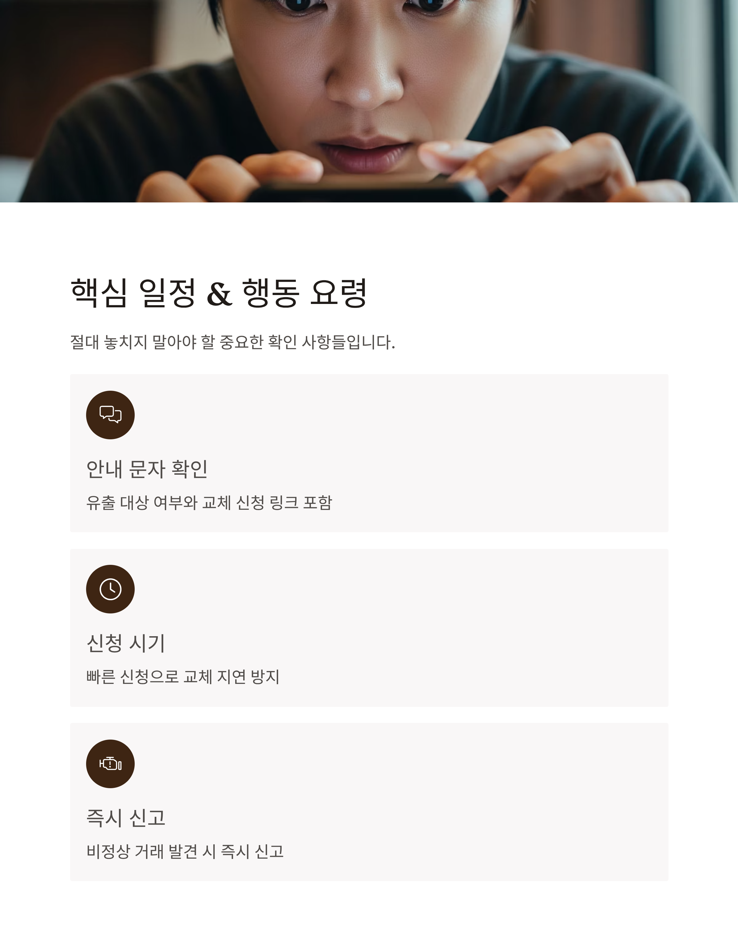 | 1단계: 문자 확인 | 유출 의심 여부, 무료 교체 대상 안내 수신 여부 확인 |