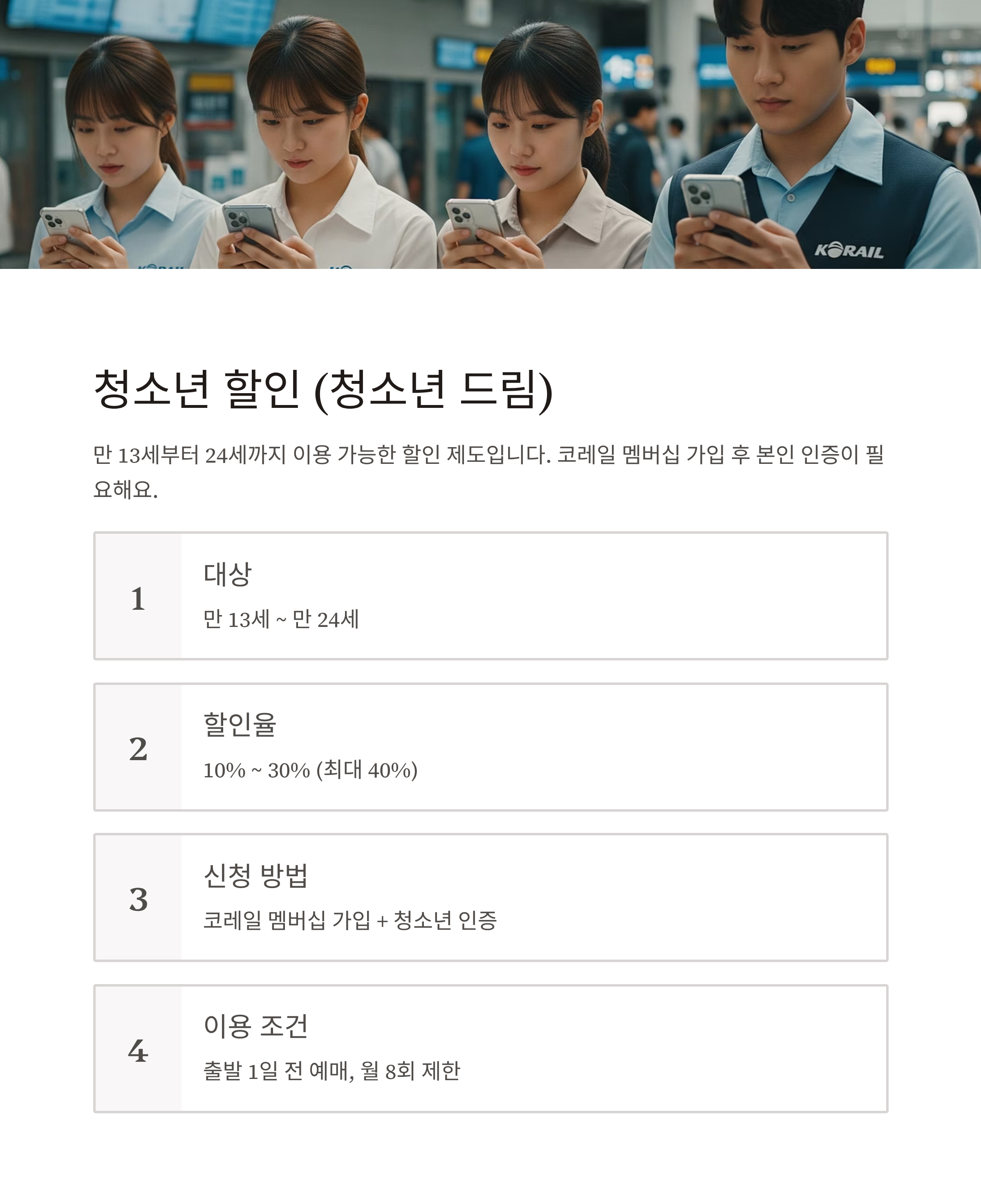 | 신청 방법 | 코레일 멤버십 가입 + 청소년 인증 + 코레일톡/홈페이지 예매 |